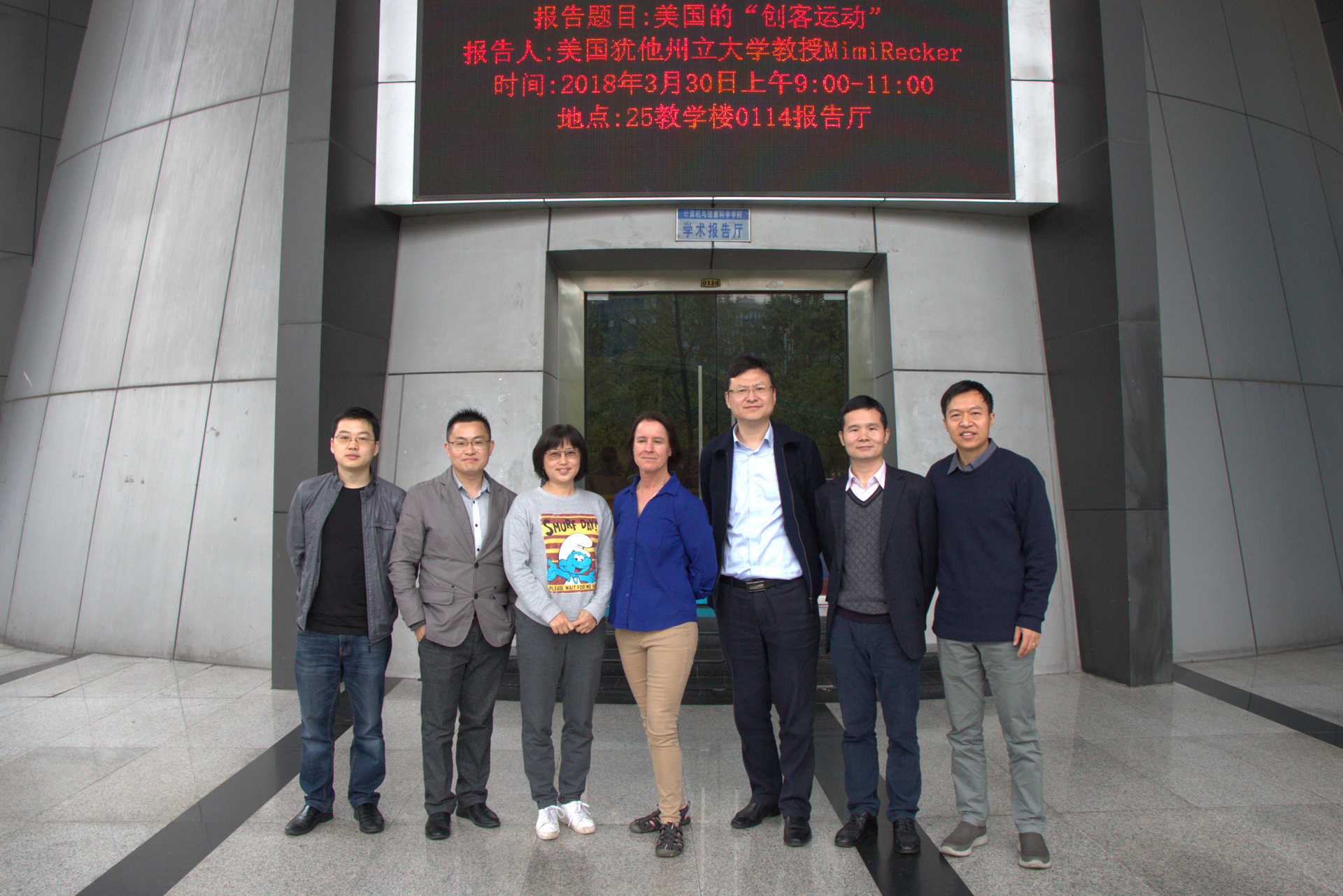 报告在一片热烈的掌声中结束,报告结束后,Mimi教授与到场的老师、同学们合影留念。本次讲座的的顺利举行为老师同学们提供了一个良好的学术交流平台,让同学们有机会与教育技术领域专家近距离接触,拓宽学科领域视野同时加深了对创客运动的认识。
