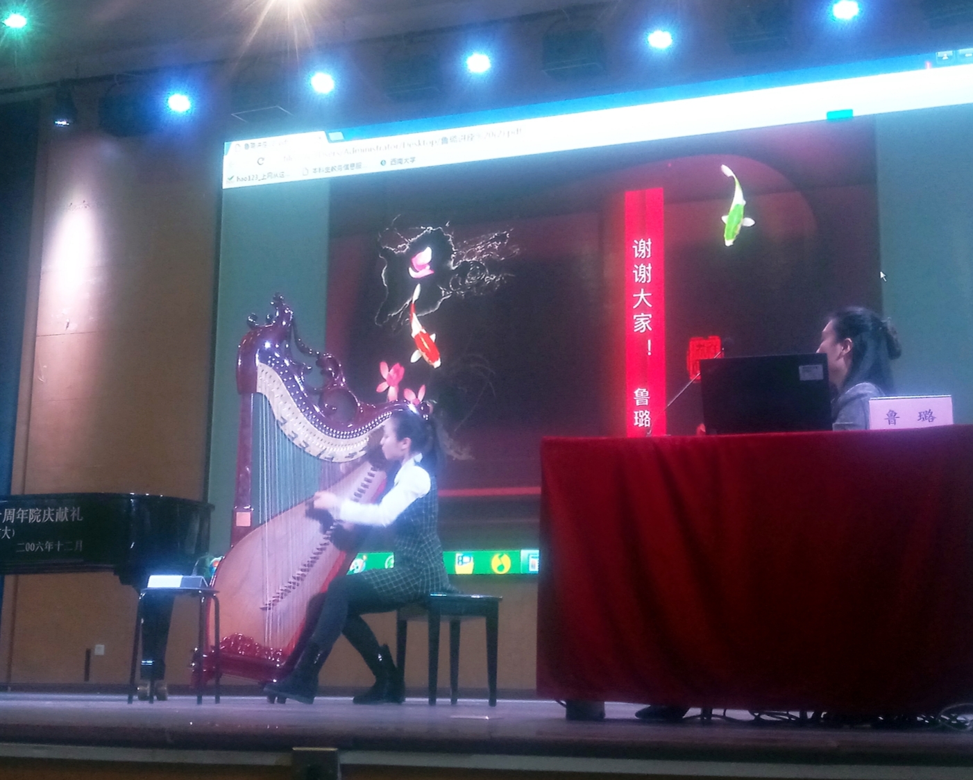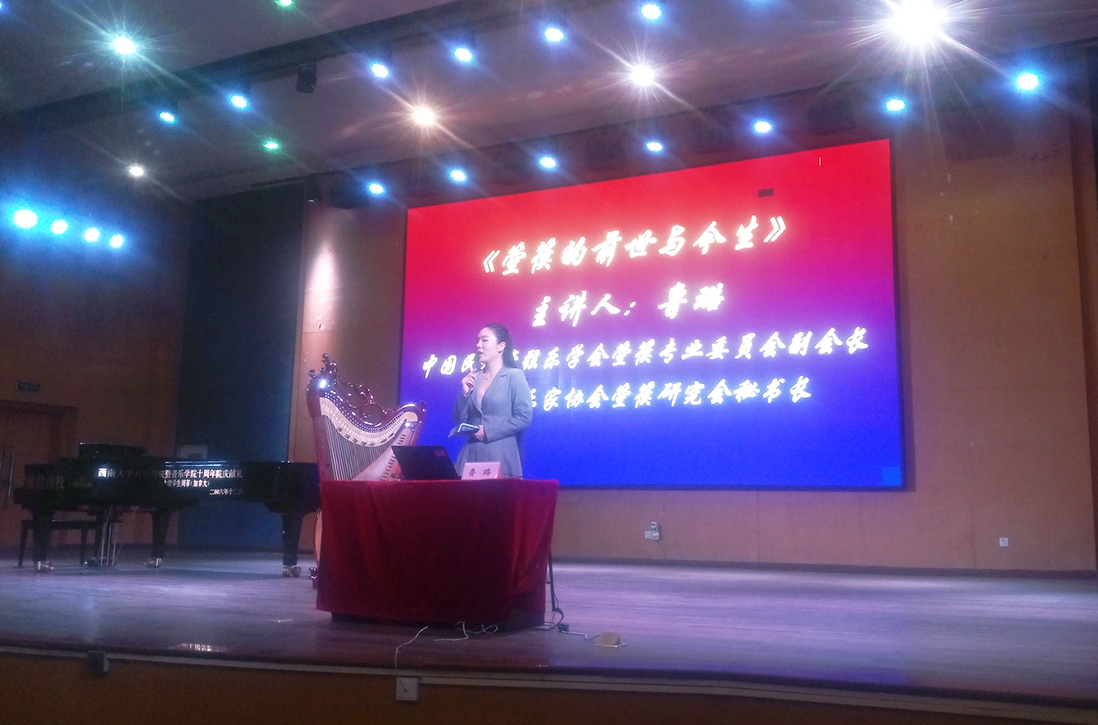 16日10点30分,由当代箜篌领军人鲁璐老师主讲的《箜篌的前世与今生》公益讲座,在音乐学院小演奏厅举行。此次讲座由betway西汉姆联音乐学院主办,“重庆箜篌”、北京鲁璐箜篌全国师资教育基地协办。旨在弘扬中国优秀的传统文化艺术,让更多人了解古代箜篌曾经辉煌璀璨的历史、当代箜篌的发展现状和未来前景。