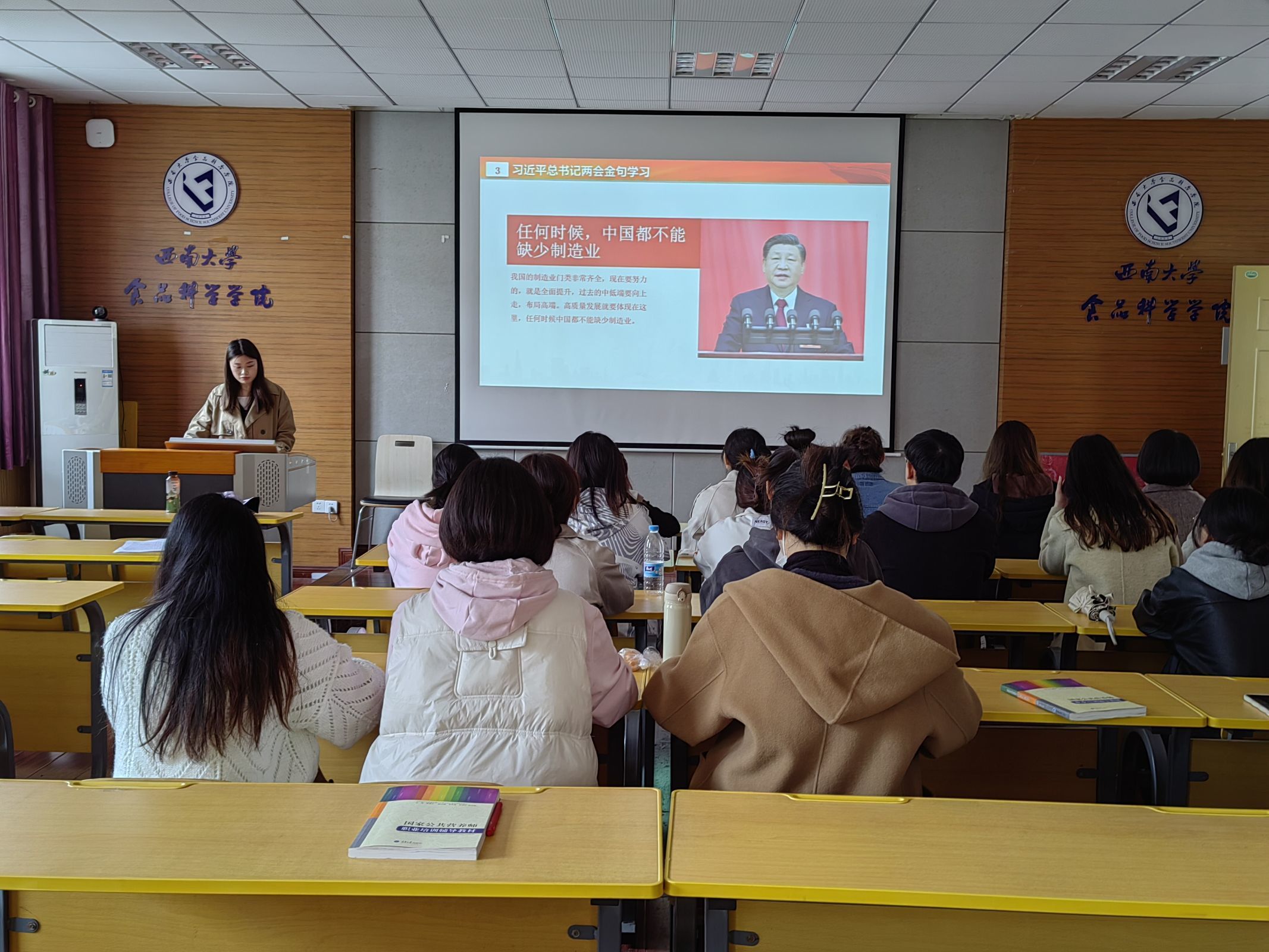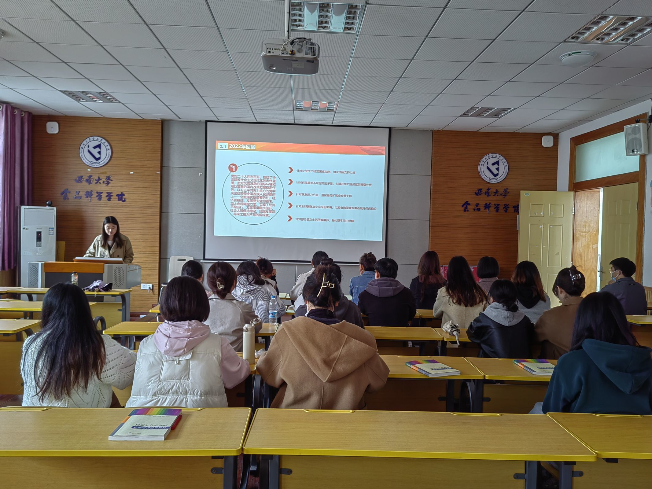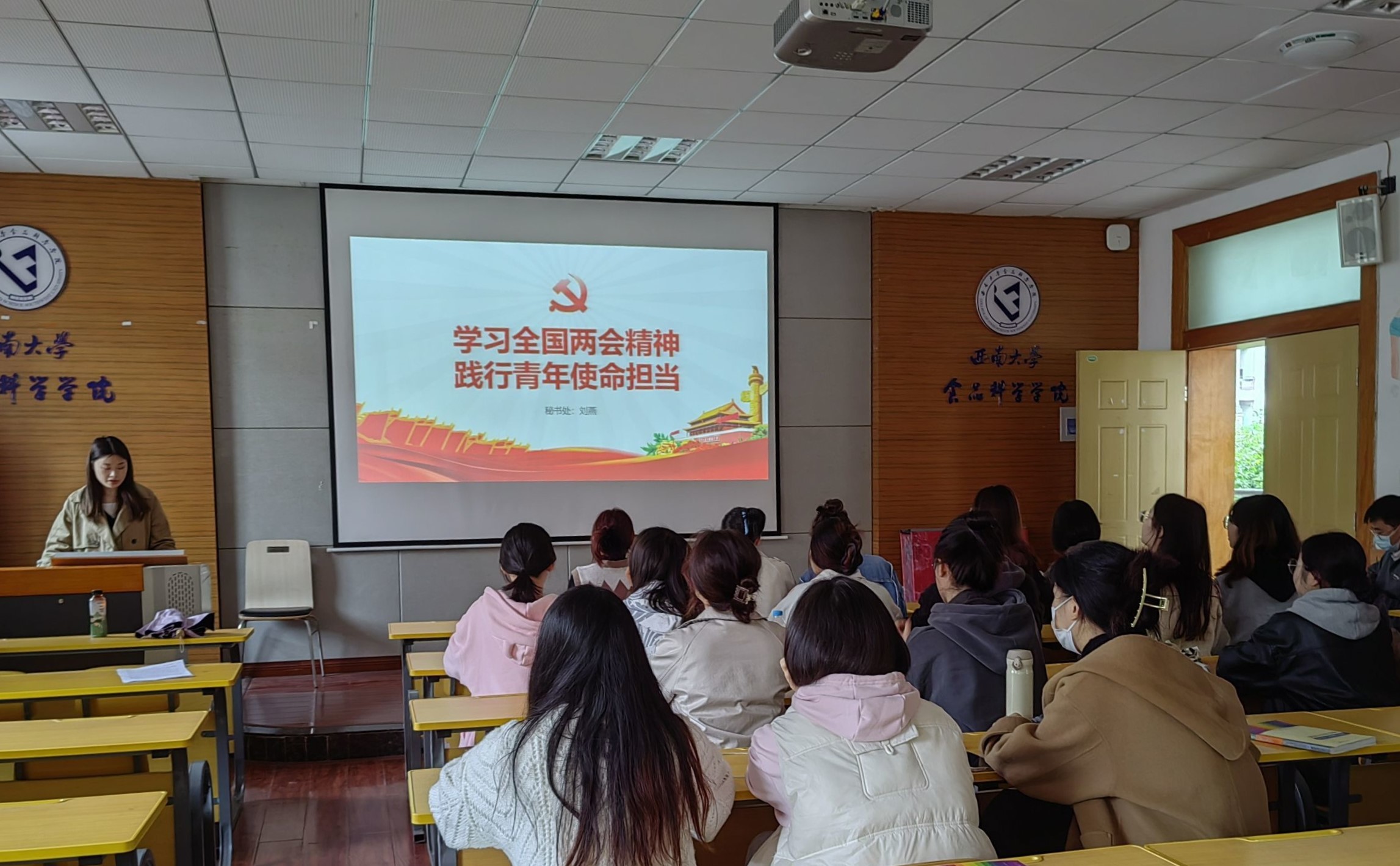 为深学笃用习近平新时代中国特色社会主义思想,深入贯彻全国两会精神,3月24日,食品科学学院研究生会在39教312开展了以“学习全国两会精神,践行青年使命担当”为主题的春季学期专题培训会。此次活动由秘书处干事刘燕主持,研会全体成员参与本次学习。