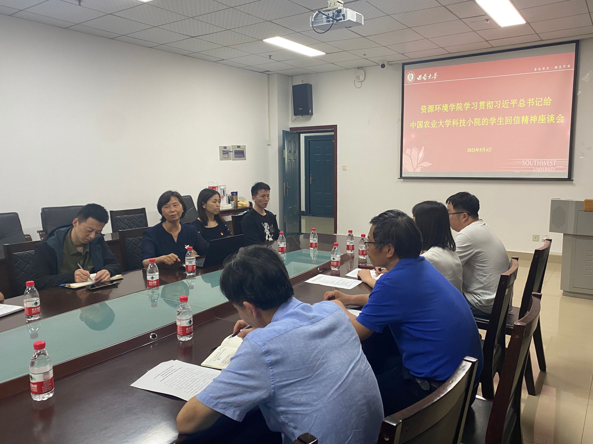 座谈会上,学院党委书记杨文导学习近平总书记给中国农业大学科技小院的学生们的回信精神。长期驻扎在科技小院的师生们结合各自在小院的学习、工作、生活分享了心得感悟。