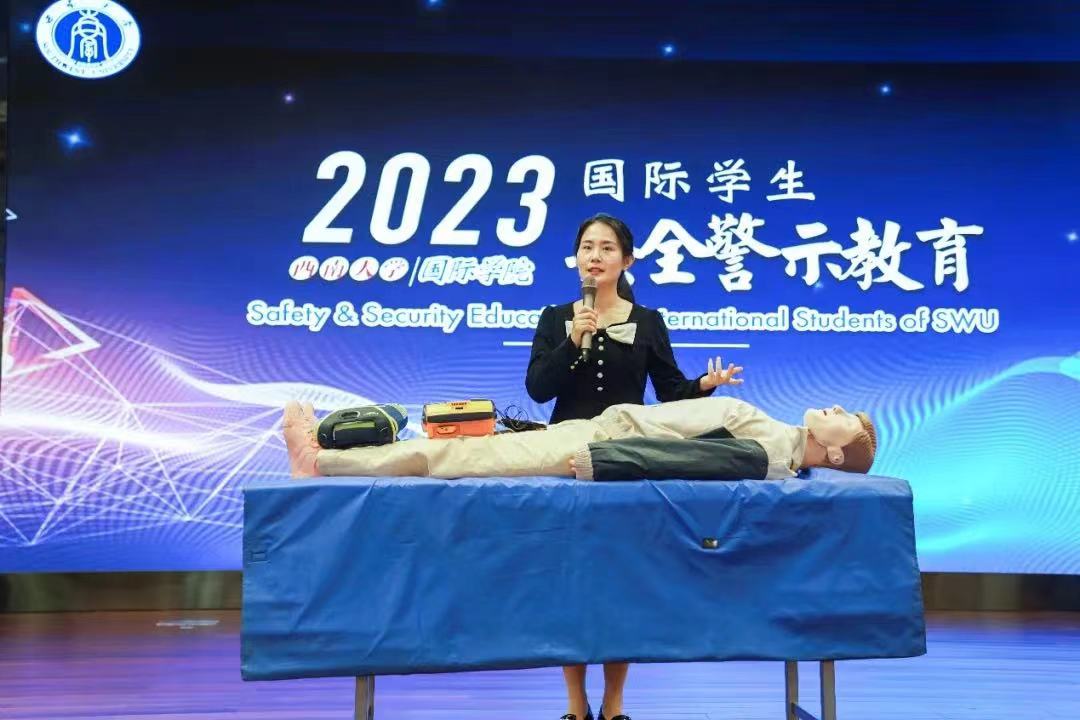 保卫处黄汀州老师分析了视频中存在的校园安全问题并以西大学子真实案例向国际学生讲解了宿舍用电安全、预防校园诈骗、校园交通注意事项、治安管理以及毒品防范普及等知识。校医院查静思医生从医疗角度向现场国际学生讲解了合理膳食的要求、意外伤害的处理并现场普及了常见的急救知识(心肺复苏及AED操作)。洪雨婷老师讲解了如何识别和应对“性骚扰”,以及面对“抑郁”等心理危机的处理方式。出入境徐振方警官则结合涉外案件讲解了非法打工及留学生勤工助学等相关知识。在场国际学生积极参与了话题讨论和现场互动。