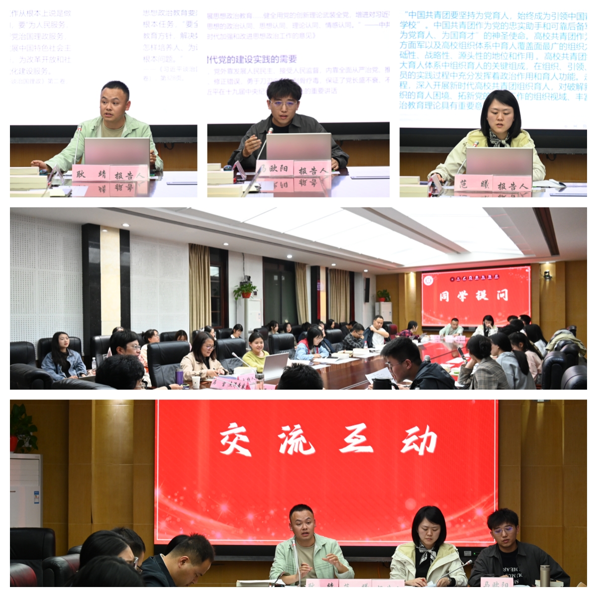 学术报告期间, 2020级博士研究生耿靖、马欧阳、范曦以“中国式现代化视域下思想政治教育塑造功能研究”“中国共产党百年来‘坚持自我革命’研究”“新时代高校共青团组织育人研究”为题分别进行学术报告。在场的同学们也积极地与3位报告人进行互动交流。