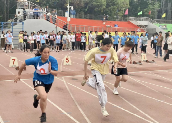 田径赛场上,黄无为老师和仇淼老师满怀热情,自信满满。枪声一响,如脱弦之箭,健步如飞,你追我赶,争当先锋。