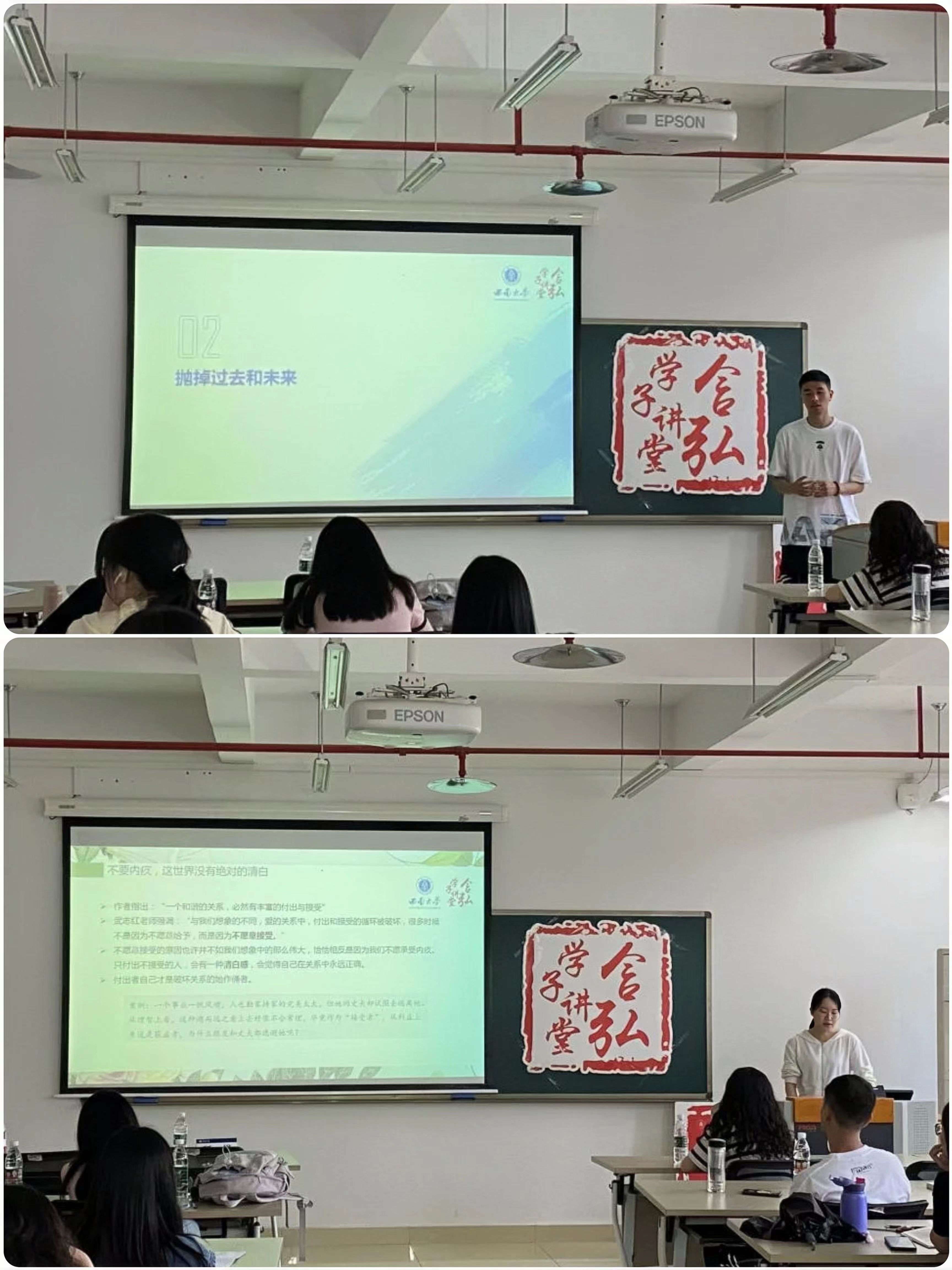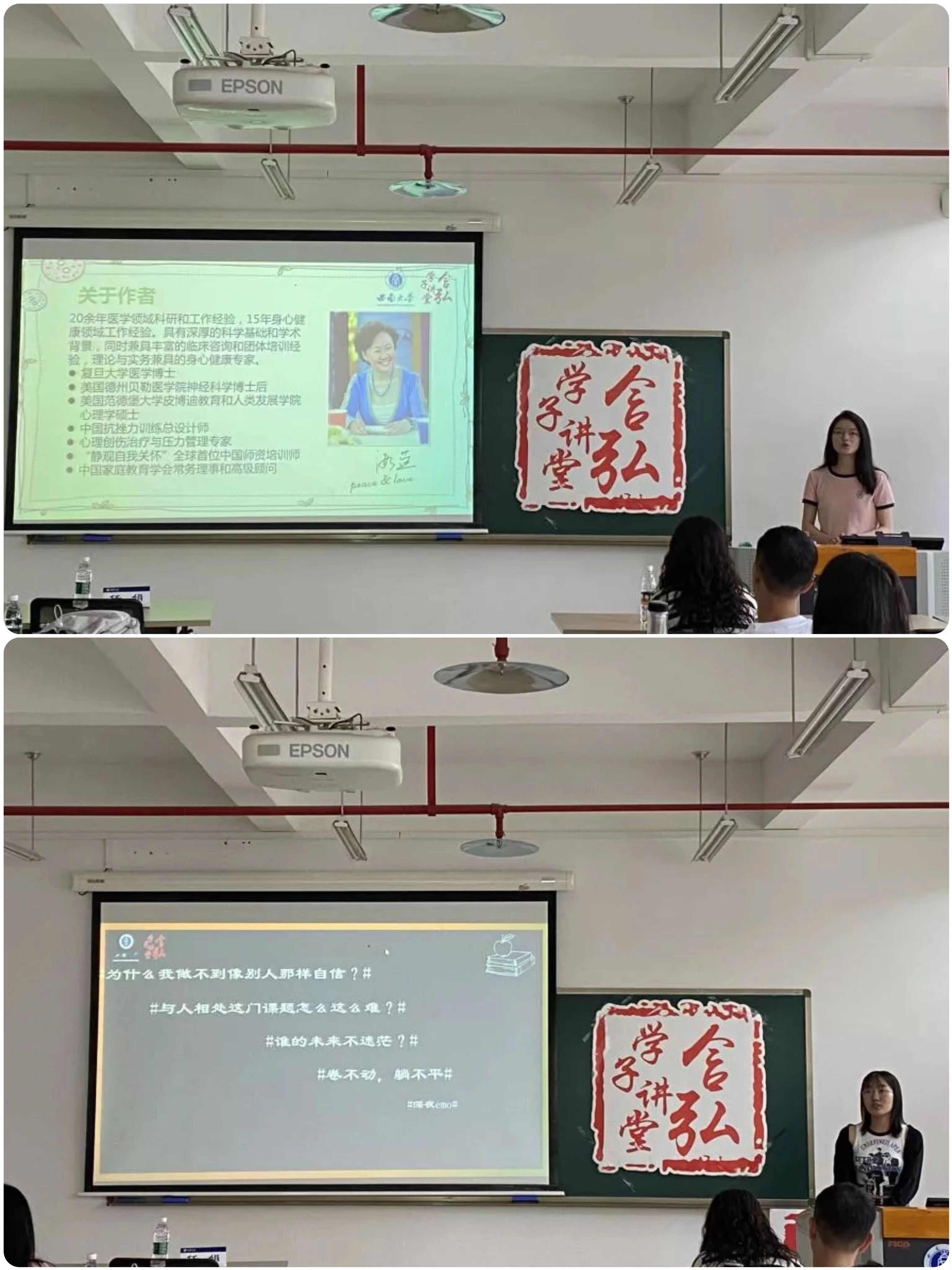 李若澜分享了《不完美,才美:情绪决定命运》一书,在此书中,沟通与理解的主基调始终贯穿全文,作者从发现人生的痛苦多来自于与人的关系入手,深度剖析亲密关系中的夫妻关系、亲子关系,职场关系等,引领我们进行自我梳理,自我发现。她首先介绍了该书作者海蓝的人生经历,随后从“认识情绪”“情绪真相”“情绪梳理七步法”“培养积极情绪”四个方面对书中精彩内容进行了分享,让同学们能更好地与人生的不如意和平相处,让一切尽在手中,从别人的故事中感到通向美好生命的路并不遥远。最后,她用“半杯水”的例子展示了情绪的多面性,并在现场带领大家体验情绪梳理七步法中的前四步,引导同学们与内心的自己深度对话,感恩自己拥有的一切,做坦荡自由的自己。