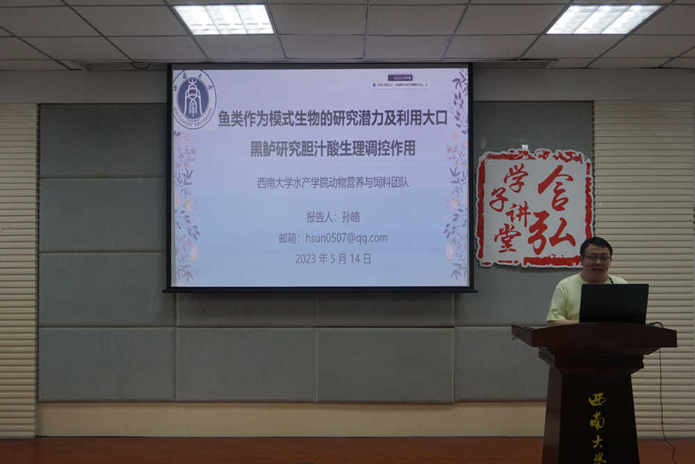 孙皓同学以“鱼类作为模式生物的研究潜力及利用大口黑鲈研究胆汁酸生理调控作用”为主题,从“鱼类作为模式生物的潜力、胆汁酸的作用机理、不同胆汁酸的调节作用”等方面详细阐述了在饲料中添加胆汁酸有利于改善大口黑鲈生长性能下降等问题。