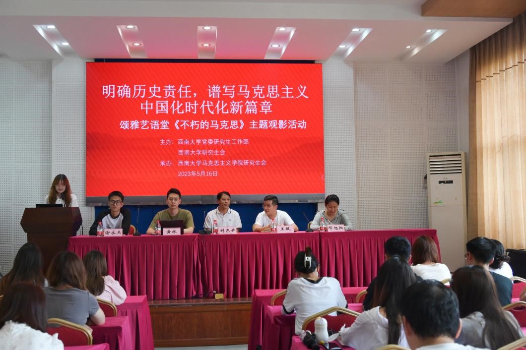 党的二十大报告指出,“实践告诉我们,中国共产党为什么能,中国特色社会主义为什么好,归根到底是马克思主义行,是中国化时代化的马克思主义行”。5月16日下午14点,马克思主义学院在学院501报告厅举办以“明确历史责任,谱写马克思主义中国化时代化新篇章”为主题的系列研学活动,以勉励全体研究生自觉做中国式现代化的坚定信仰者、忠实实践者、可靠奋斗者。本次活动面向全校研究生开展,来自农学与生物科技学院、教师教育学院、历史文化学院民族学院等兄弟学院的50余名研究生积极响应参加。马克思主义学院党委副书记、纪委书记刘东升,辅导员王飒、黄林老师,校研究生会成员邓旭阳、谢永杰同学及马克思主义学院研究生会全体成员参与。