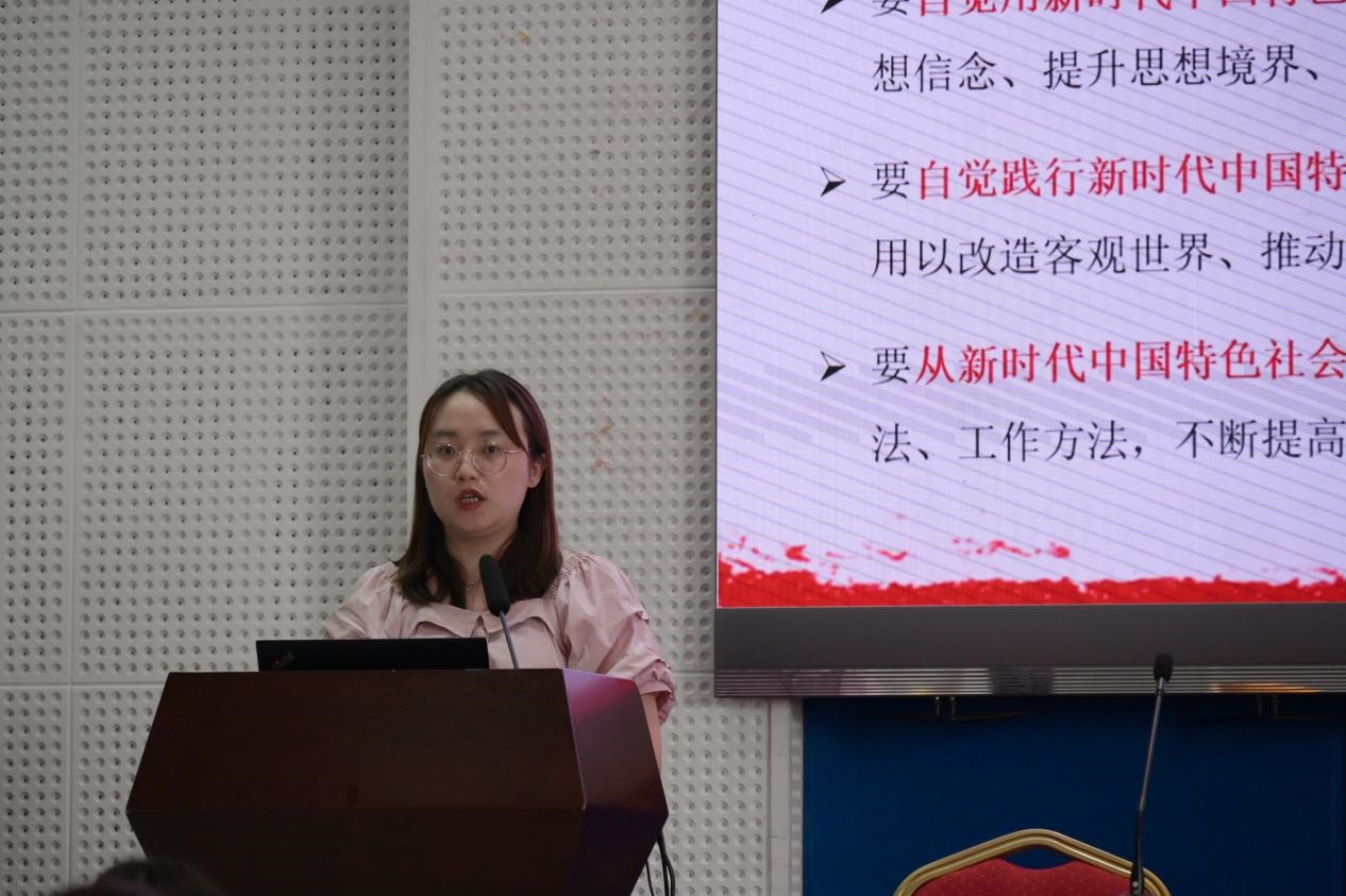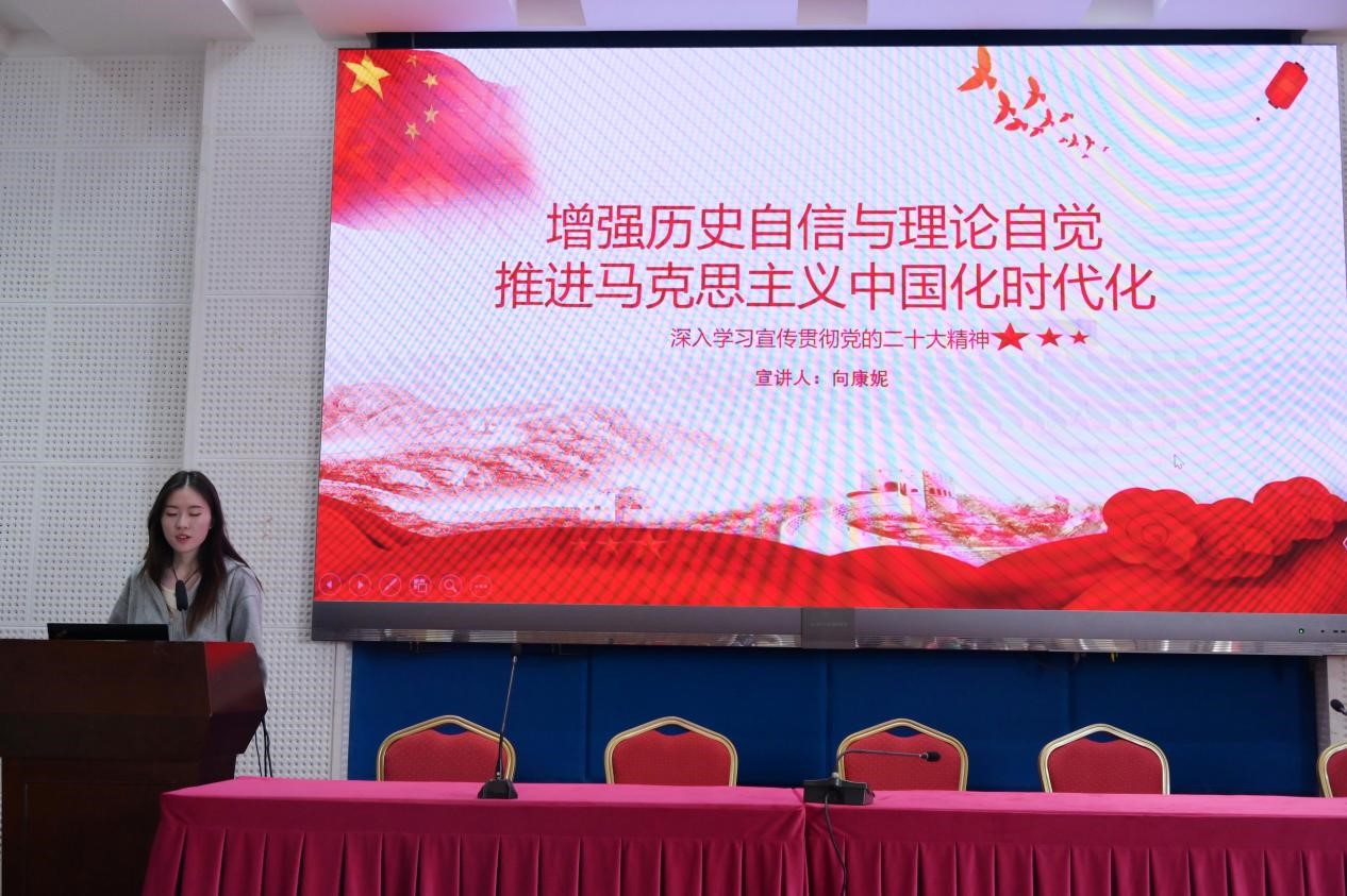 2022级马克思主义中国化研究专业硕士研究生向康妮同学以“增强历史自信与理论自觉,推进马克思主义中国化时代化”为主题进行理论宣讲。她强调,马克思主义从诞生起,就密切关注和回答时代和实践提出的重大课题。新时代的青年党员要以强烈的历史自信、高度的理论自觉学习和认识习近平新时代中国特色社会主义思想,坚持好、运用好贯穿其中的立场观点方法,真正担当起当代中国共产党人的庄严历史责任。