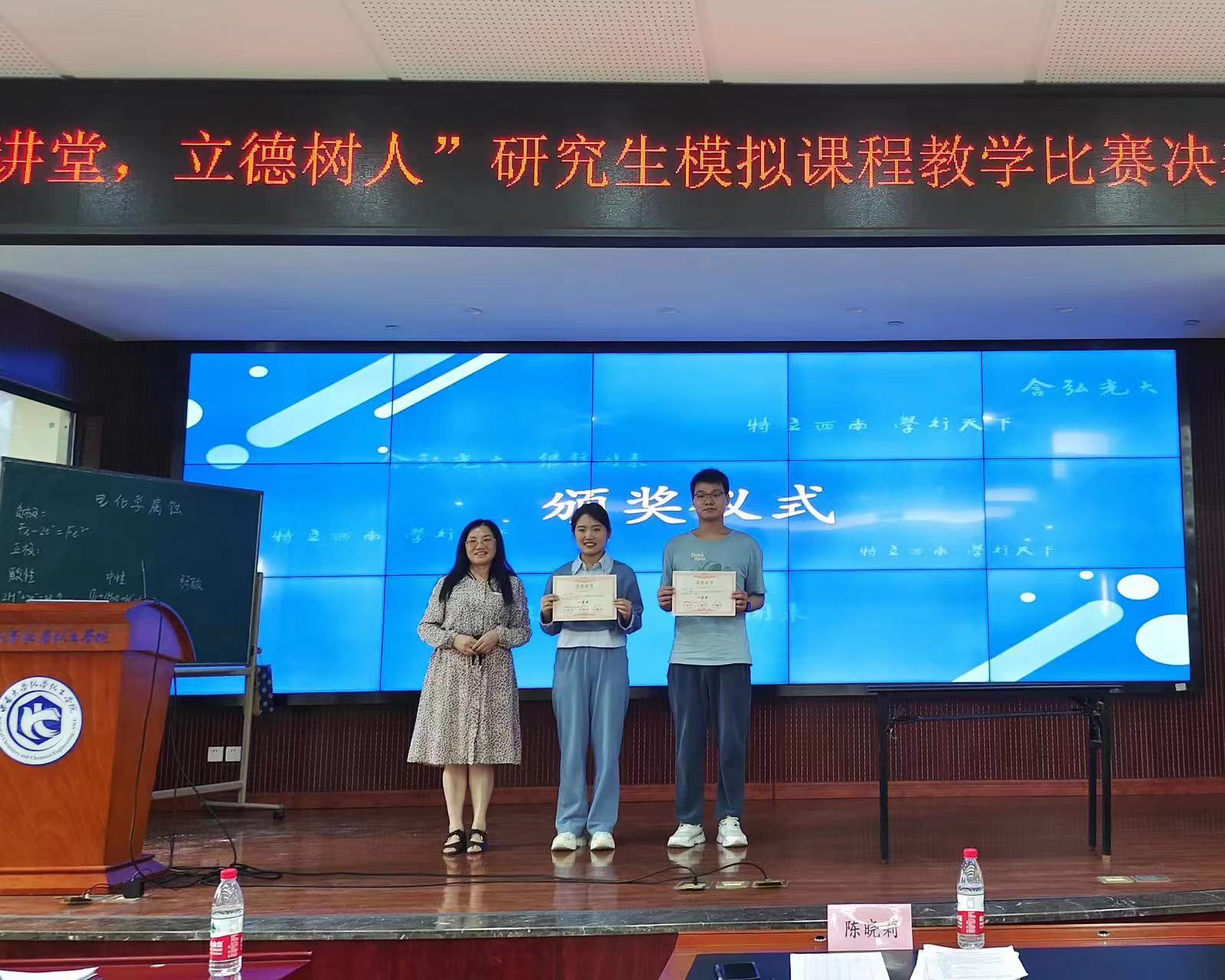 经过初赛选拔,共有十二位选手进入决赛。此次比赛顺序由选手抽签决定。选手们自选课程内容,自定题目,准备充分,在讲课期间自然投入、生动模拟、精彩纷呈。有的声情并茂,灵动自然;有的抑扬顿挫,循循善诱。通过短短10分钟的模拟讲课,12位同学展示了扎实的前期准备工作以及各自独特的教学风采!比赛过程中,选手们不拘泥于传统授课方式,通过教学、实验、音视频相结合等多种方式,使课堂氛围更生动。讲课的内容选用寻找重心的实例演示、与实验相结合的乙醇结构分析、与生活相结合的“单调性”等教学课程,展现了选手们饱满的精神和良好的教学功底,赢得了观众们热烈的掌声。经过评委老师们严谨认真、客观公正的打分,评选出一等奖2名:周崴,朱彤;二等奖3名:刘见英,罗媛媛,张曼琦;三等奖3名:李文,温馨,朱欣;优秀奖4名:冯佳敏,刘长琳,赵莉丹,李旭。