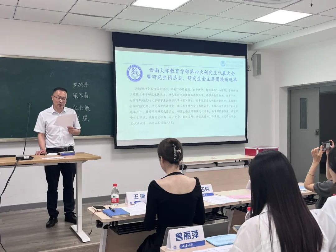 为加强研会学生干部队伍建设,保证学生工作连续性,发挥模范引领作用,加快搭建帮助学子展现自我、挑战自我、实现自我的成长平台,2023年6月2日,betway西汉姆联教育学部第四次研究生代表大会暨研究生团总支、研究生会主席团换届大会在田家炳教育书院518教室顺利举行。教育学部党委副书记、纪委书记卓玉兵老师,教育学部团委书记李晶晶老师,教育学部研究生团总支书记王潇老师,研会全体成员及2021级、2022级研究生代表出席了本次大会。