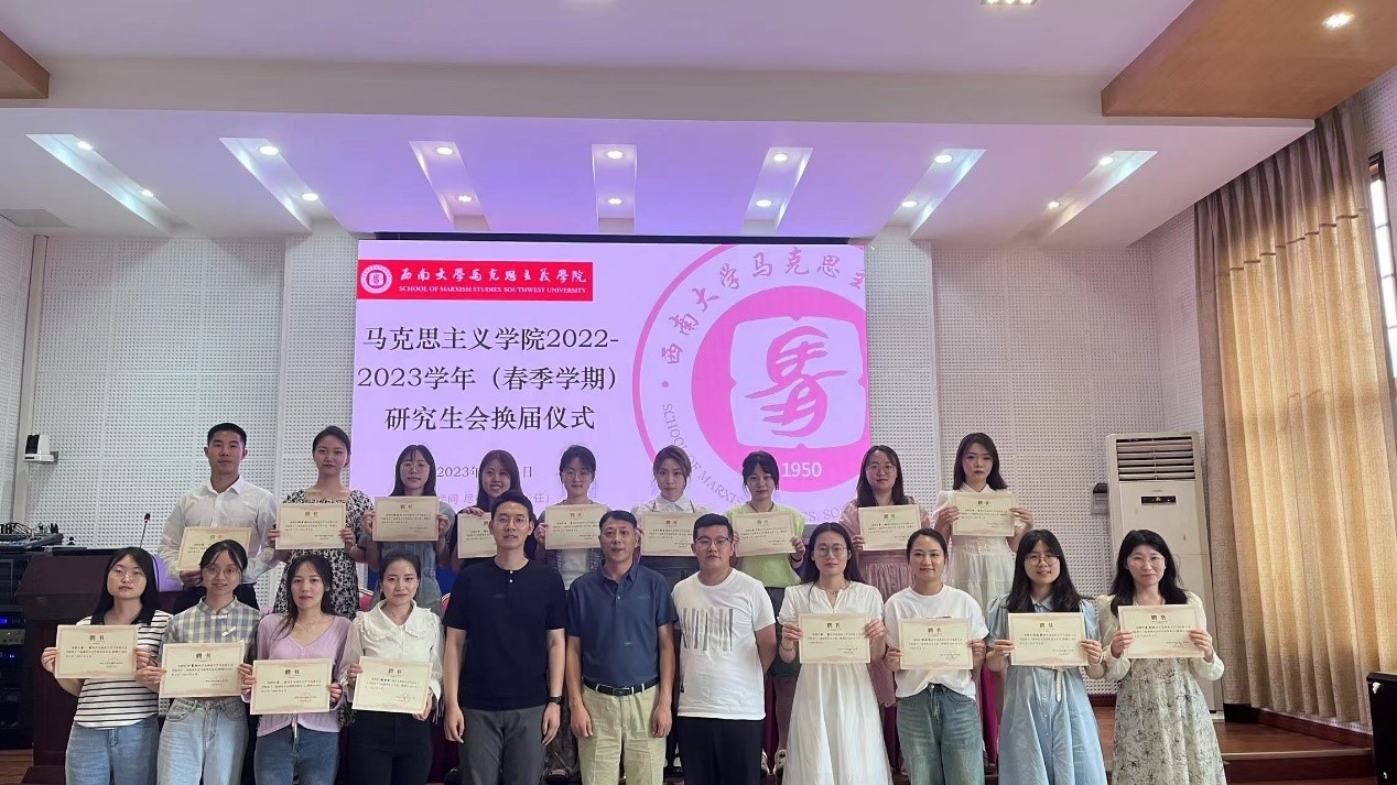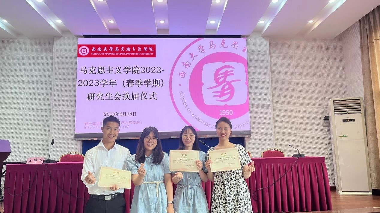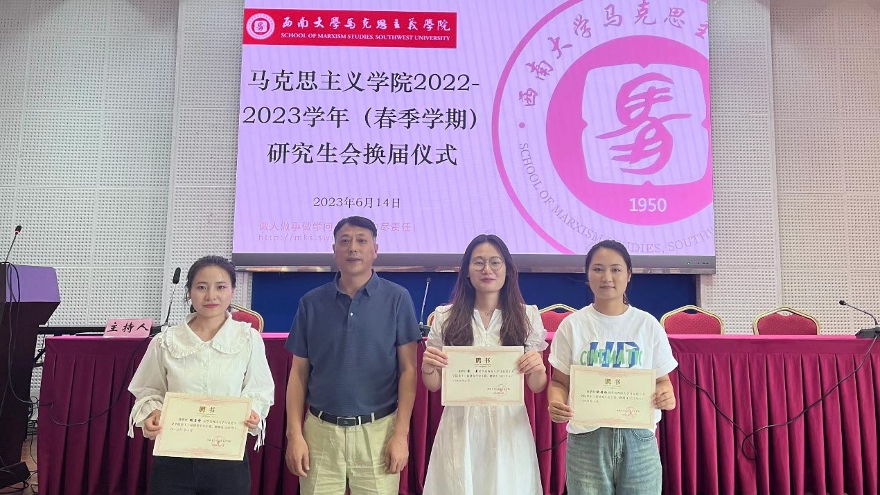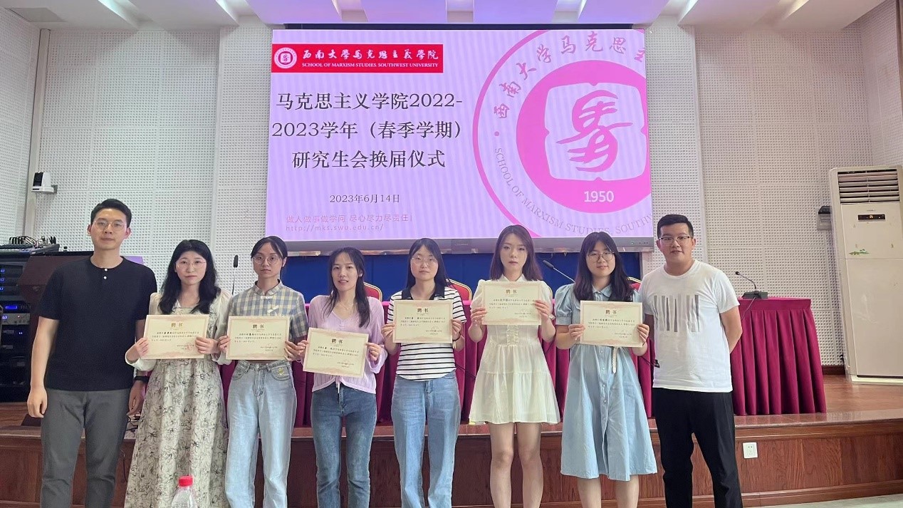 述职结束后马克思主义学院第十三届研究生会主席团宣布马克思主义学院第十四届研究生会成员,主席团成员和各部门负责人为研会工作提供了宝贵的经验与意见。辅导员王飒和黄林与第十四届研究生会成员进行交流分享。交流结束后,学院老师和第十三届主席团分别为下一届主席团成员和部门负责人颁发聘书并合影留念。