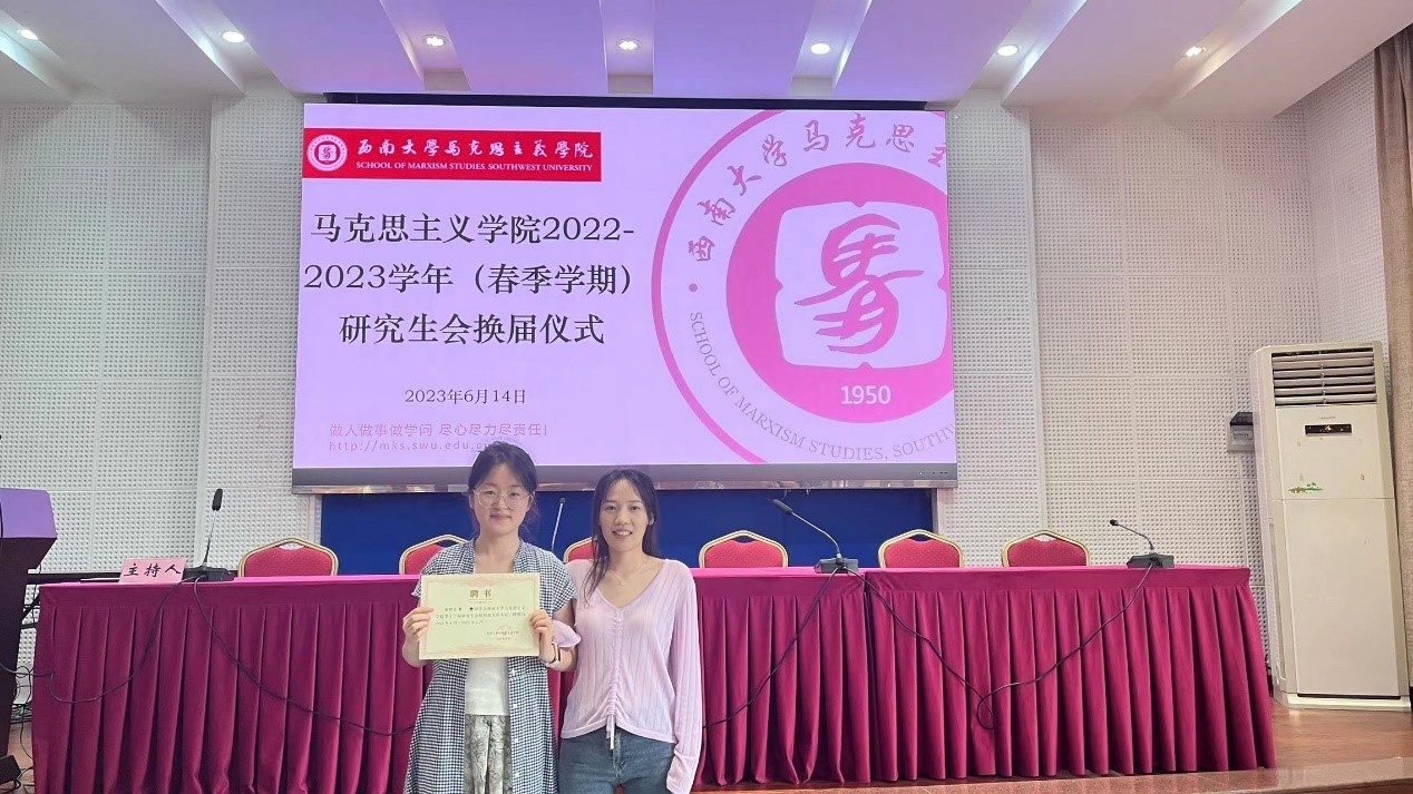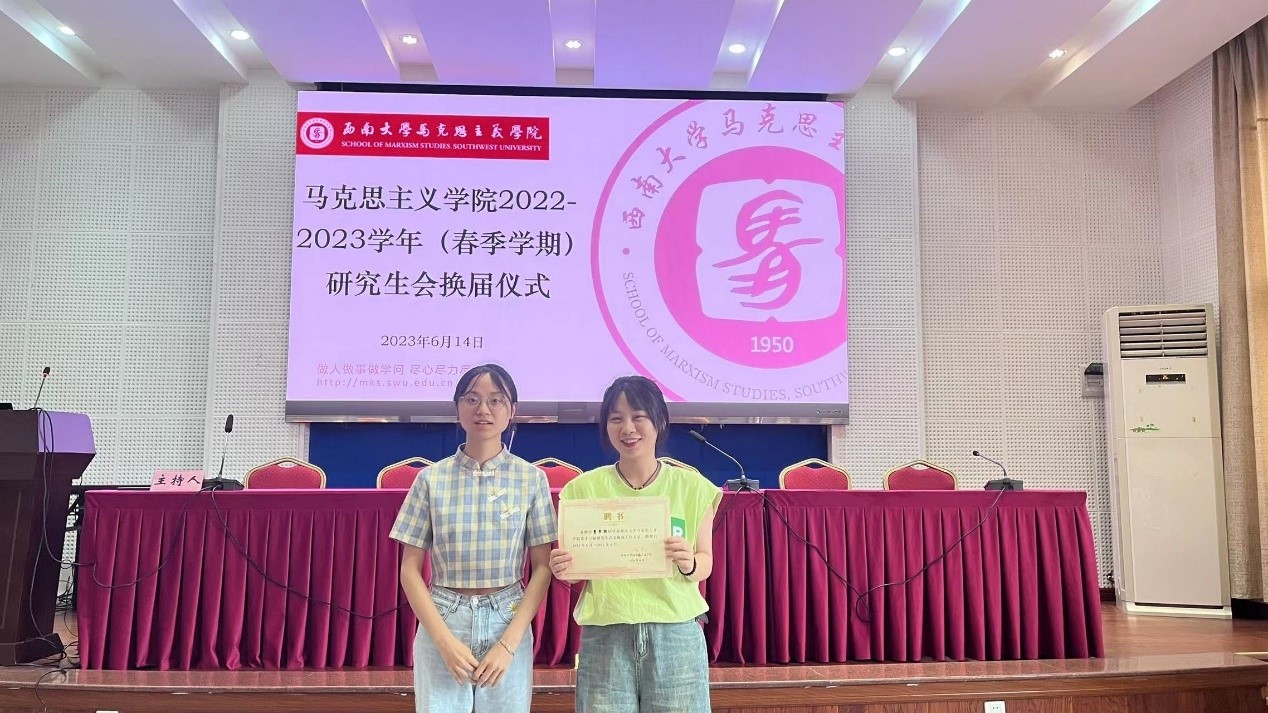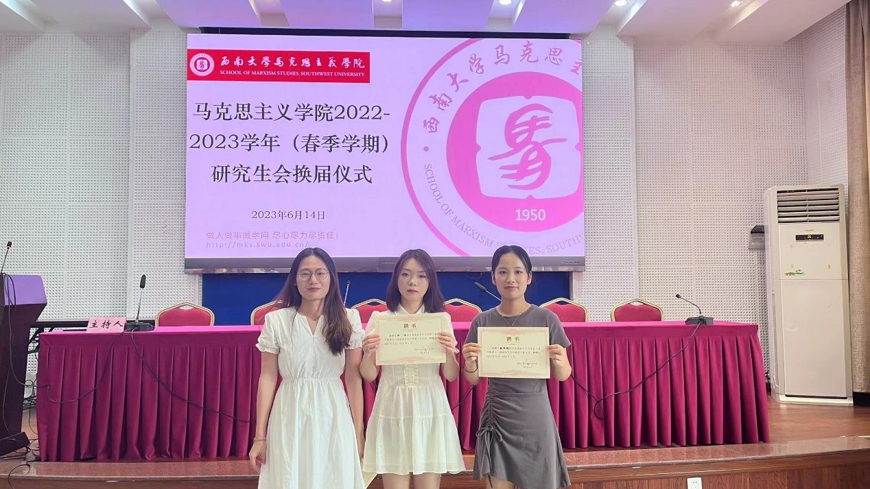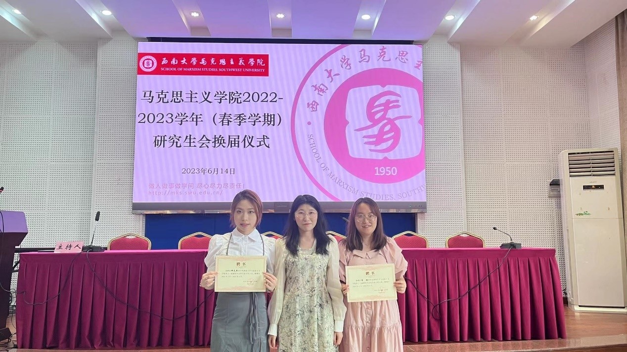 述职结束后马克思主义学院第十三届研究生会主席团宣布马克思主义学院第十四届研究生会成员,主席团成员和各部门负责人为研会工作提供了宝贵的经验与意见。辅导员王飒和黄林与第十四届研究生会成员进行交流分享。交流结束后,学院老师和第十三届主席团分别为下一届主席团成员和部门负责人颁发聘书并合影留念。