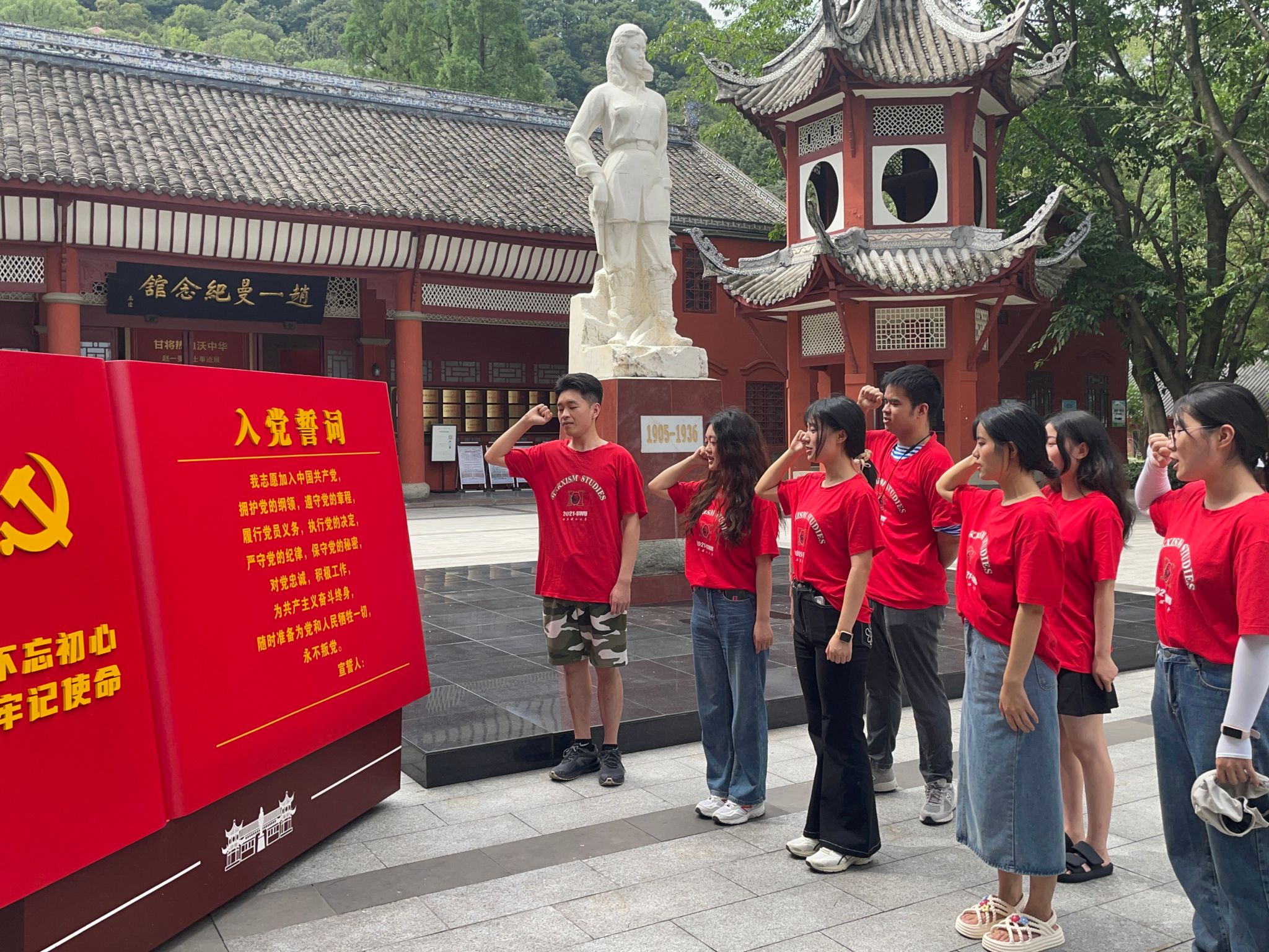 在进入纪念馆前,队员们先在赵一曼雕塑前宣读入党誓词。参加本次实践活动的所有党员用铿锵有力,掷地有声的誓言坚定了对马克思主义的信仰、共产主义的信念。
