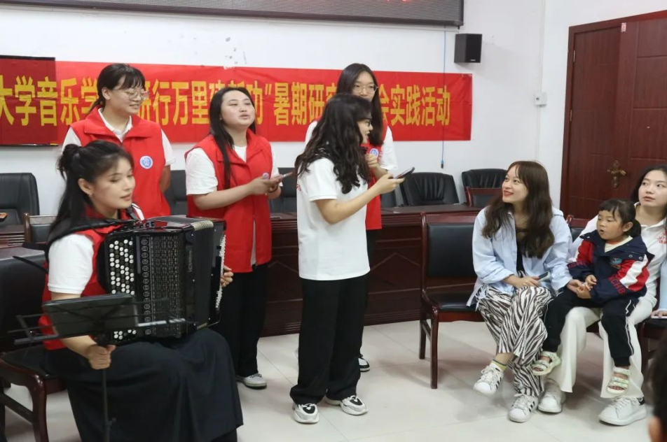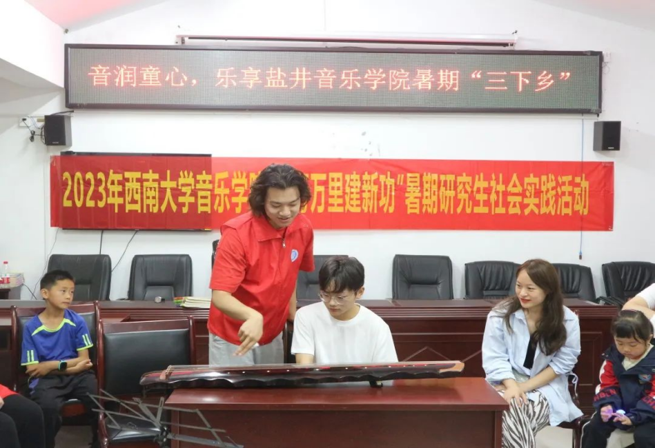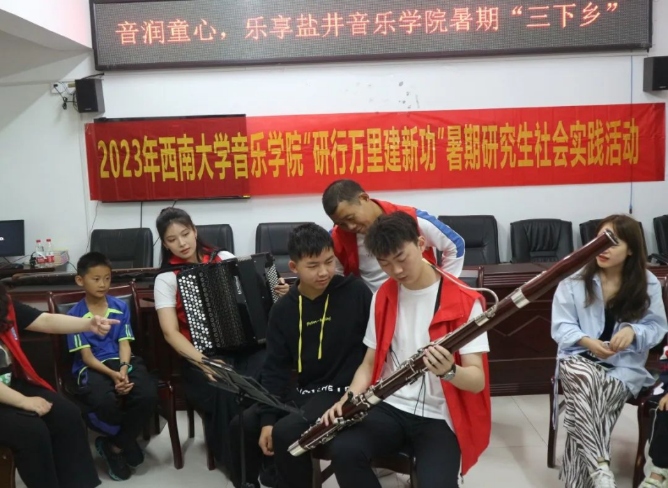 7月4日,实践队前往中益乡盐井村,用音乐关爱留守儿童,暖心田、润童心,开展了一场生动精彩的音乐课。隔代养育、长期与父母分别等现实情况,导致有些留守儿童存在着隐性或显性的情感缺失,大多表现得内敛、敏感、偏激。实践队队员们带领小朋友们认识和鉴赏手风琴、巴松、古琴等乐器,引导小朋友们通过音乐去记录心情、表达情感,使心灵得到疗愈。最后,实践队队员向小朋友们教唱了一首歌曲——《送别》,希望音乐能成为小朋友们的情感寄托。课堂结束后,实践队队员们还为留守儿童送上了文具和读物,希望能为他们的心灵点亮一盏灯。