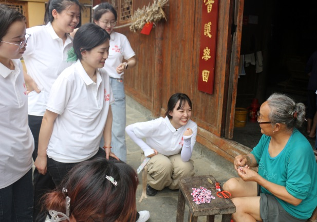 实践队随机走访了一位当地村民,只见她闲适地坐在家门口,手中的针线来回穿梭,而她手中所绣的不仅是一件件饰品,也是更加幸福美好的生活。交谈中,老奶奶嘴角上扬,洋溢着满足的喜悦,这让我们回忆起了精准扶贫陈列馆展厅墙上村民的一张张笑脸,那是艰苦奋斗精神结出的一颗颗蜜饯。
