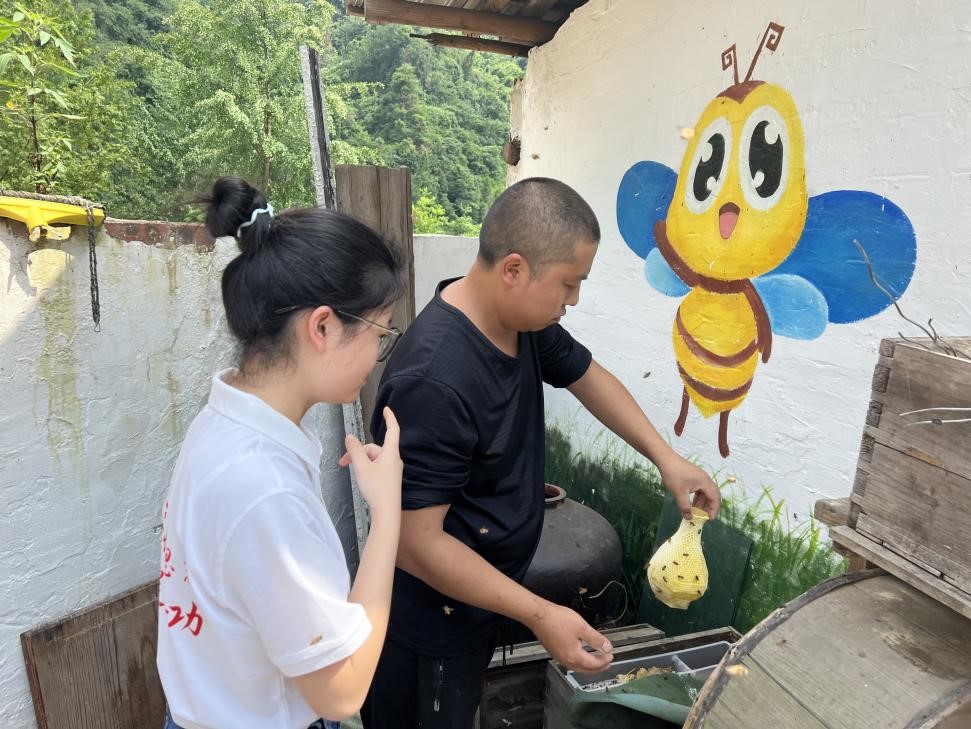 第二站到达蜂蜜产业基地,实践队参观了陈小平中蜂养殖厂。陈小平向队员们讲解了蜜蜂的习性,邀请队员们品尝正在酿造的土蜂蜜,并展示了极具美观性和艺术观赏价值的3D打印蜂蜜模具,介绍了能够实时监控蜜蜂数量以及产蜜量的智能蜂箱。随着蜂蜜产业的发展,养蜂也逐渐趋于智能化、现代化、产业化,经过陈小平的介绍,队员们对蜂蜜产业未来发展充满期待。