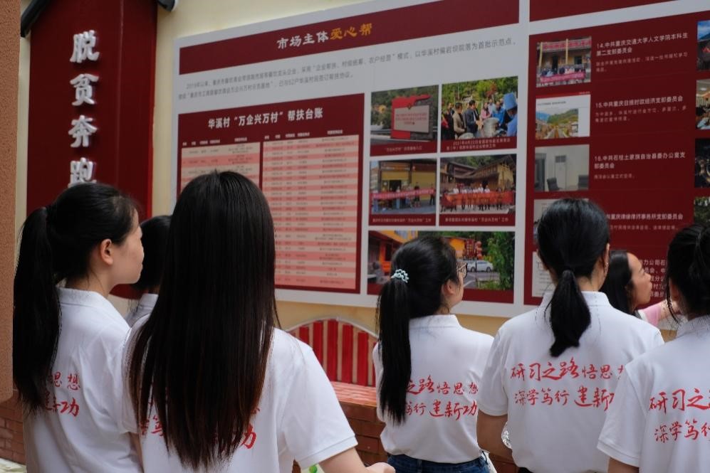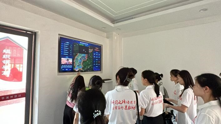 2023年7月10日,实践队沿着习近平总书记考察调研的足迹,到达石柱土家族自治县中益乡华溪村。此时距离习近平总书记考察华溪村已经过去了四年,当实践队到达华溪村时,村里的发展让大家眼前一亮。基层工作人员亲切地为实践队讲解了这几年村庄的发展历史与“万企兴万村”帮扶台账,并通过电子数控大屏的动态监测介绍了华溪村计划帮扶项目、就业农村劳动力、新增就业等各项指标。通过讲解,队员们深入了解了华溪村乡村振兴历程和未来的发展规划。同时队员们对工作人员谭郡同志进行采访,了解到其为了发扬家乡红色旅游文化、提高全村收入而返乡,深刻体会到基层工作人员在乡村振兴中的辛勤付出,被他吃水不忘挖井人的精神所打动。