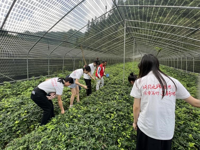 第一站到达黄连基地,社工向实践队介绍了黄连产业是农民的重要收入来源,要五年才能收获,并且黄连的生长习性喜阴,因此需要人为建庇阴棚供给黄连生长。之后队员们跟随社工进行黄连的除草作业,感受到了种植人工作的辛劳,同时也体验了一门生动的实践课,切实领悟了挖掘种养过程的知识。