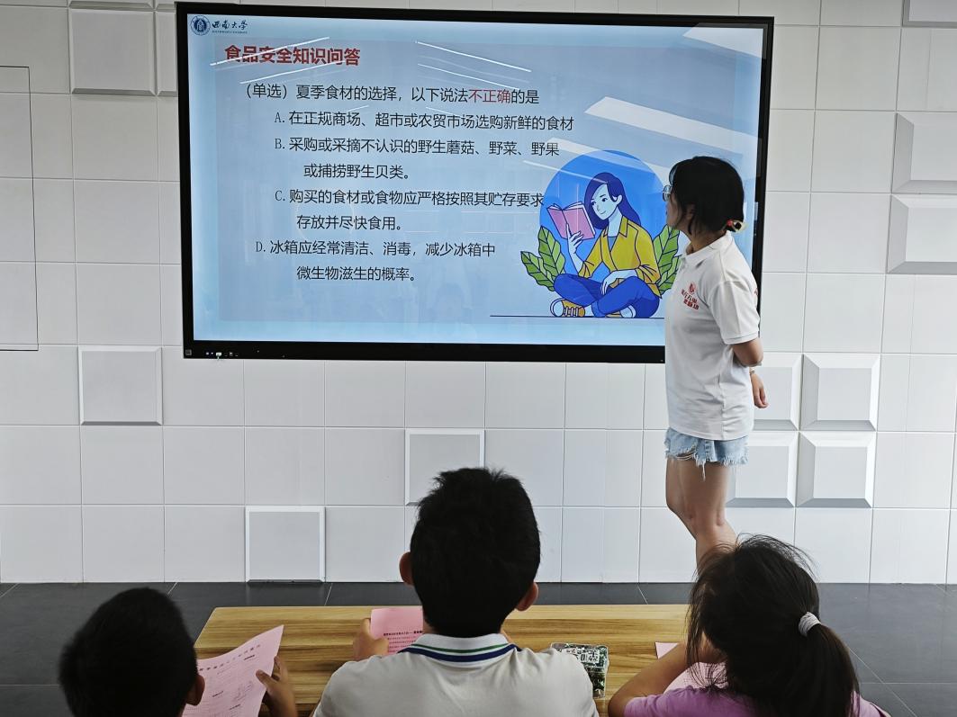 紧接着,实践队员在永丰村综合服务中心为村里的青少年开展了夏季食品安全知识宣讲活动。实践队员就食品的采购、保存、饮食建议等内容进行讲解,并利用实际食品包装演示和知识问答,教会他们如何通过外包装判断食品是否在保质期内,增强青少年的食品安全意识。