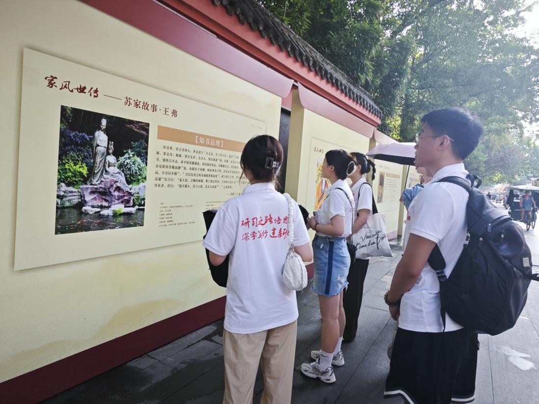 7月23日上午,实践队一行10人来到四川眉山三苏祠。在讲解员的讲解下,队员们对三苏祠的历史、祠中苏宅古井、并蒂丹荔以及东园·碑廊有了深入的了解。“我们是在这块土地上的文明培育出来的,全党全民族都要敬仰我们自己的文化,坚定文化自信。”回忆起习近平总书记对三苏祠的寄语,实践队员深有感触,积淀在民族记忆中的文化认同被清晰唤起,也更加坚定了新时代新的文化使命。