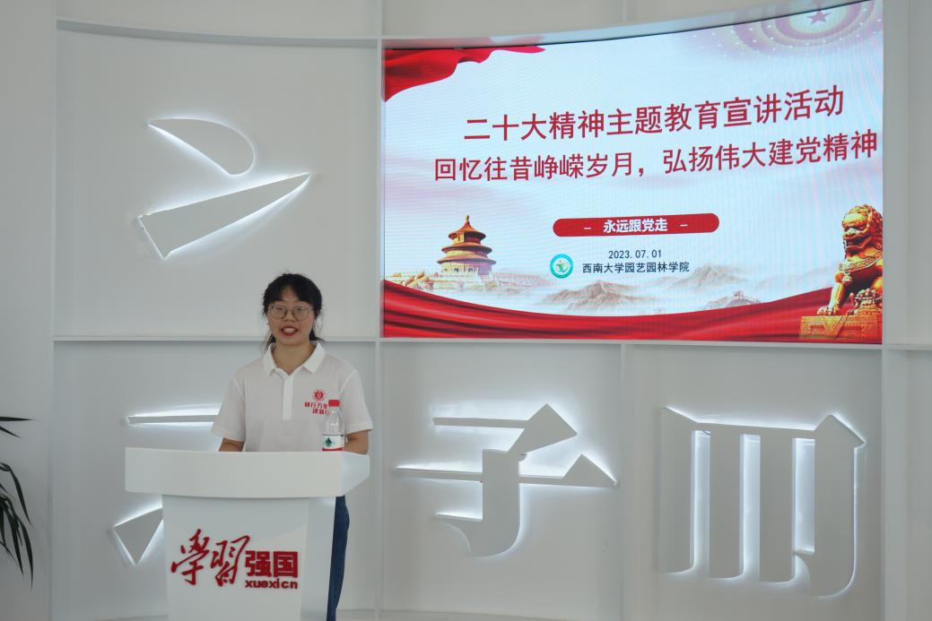 7月1日下午两点,“艺研成林”实践队在战旗村初心馆二楼开展二十大精神主题教育宣讲活动。宣讲人徐颖以真挚的感情、生动的语言和多维的视角,紧扣党的二十大精神和习近平新时代中国特色社会主义思想,围绕党的二十大的主题、主要成果、丰富内涵、中国式现代化、全面建设社会主义现代化国家的目标任务等方面作了系统解读,深刻阐述了如何深入学习贯彻党的二十大精神。徐颖以自身学习生活经验为大家解读了如何在坚持用习近平新时代中国特色社会主义思想凝心铸魂。告诫我们应该坚持不懈地悟初心、守初心、践初心。