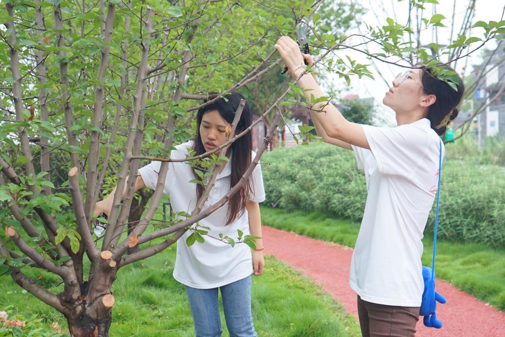 7月3日,“艺研成林”实践队成员结合战旗村居住区绿化植株树木的生长态势,枝条的分布情况和所需要的形状进行修剪,从疏枝入手,剪除枯枝、密生枝、重叠枝,再对留下的枝条进行短剪。将广场绿篱剪去高枝,修平侧枝,统一高度,形成紧枝密叶的效果,显示立体美。以更好使新枝不断发生、更新和替换老枝,切实提升了当地的村容村貌,深入实施乡村绿化美化行动,促进村庄形态与自然环境相得益彰。