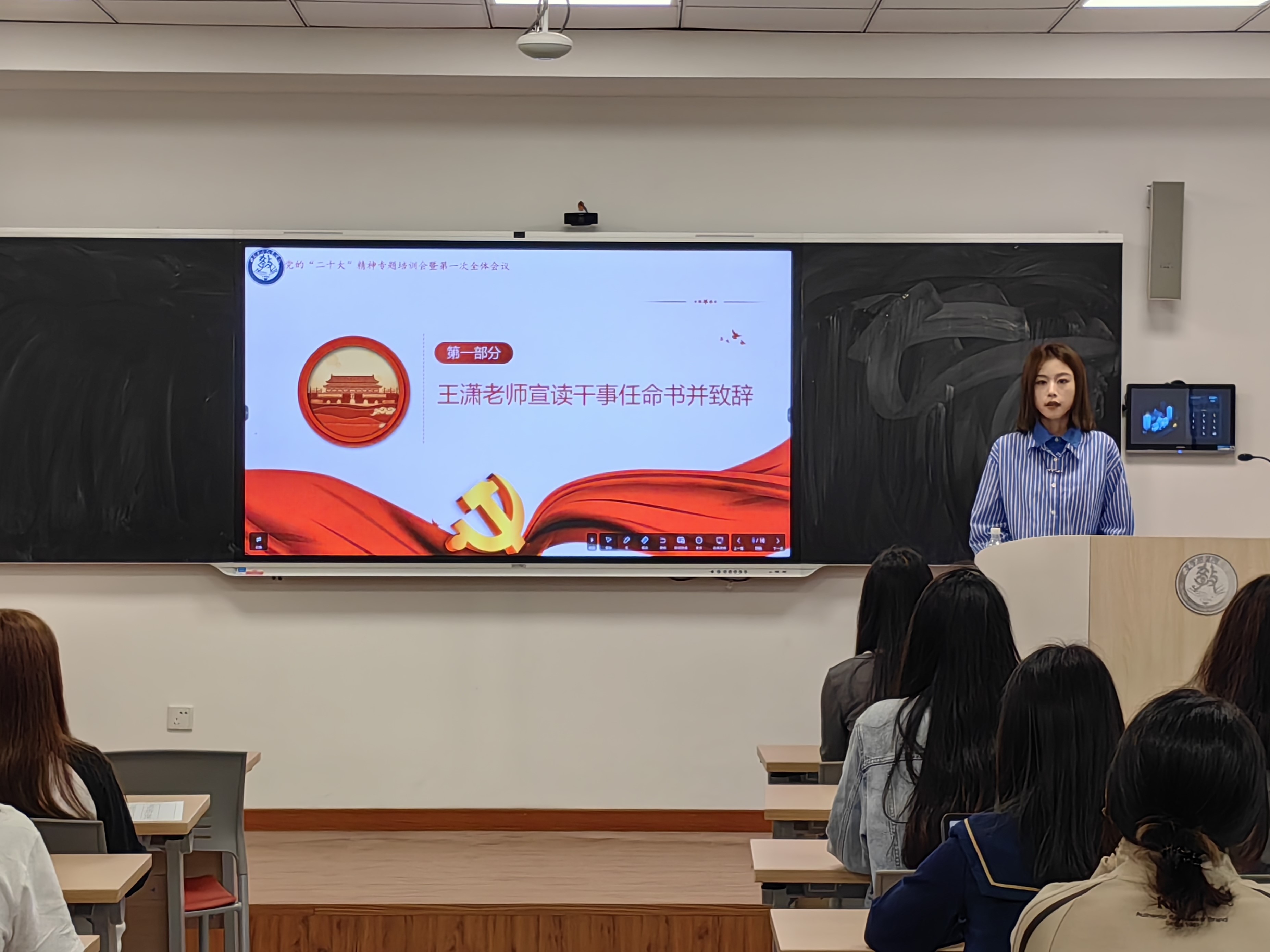 王潇老师宣读新一届干事任命决定与致辞,并详细阐述了研究生会的常规职责,要求各部门严谨履行职能,积极开拓创新,持续提升服务水平,同时,时刻牢记学生本位,切实做好学术研究。王潇老师还指出,各部门之间要齐心协力,砥砺前行。