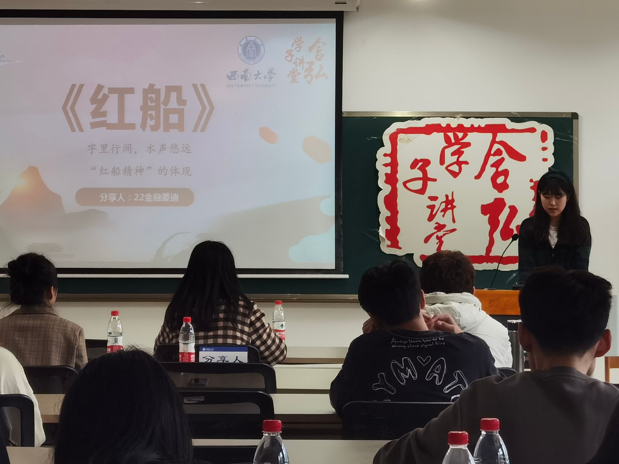 姜迪同学分享了革命题材书籍《红船》。她首先通过讲述南湖红船的故事,将大家带回了那个红色的革命年代。随后,她讲述了当时发生的历史事件以及一些伟人事迹,向同学们展现了第一批中国共产党人思考中国路向何处的故事视角,全方位展现中国共产党的诞生过程及其诞生的历史必然性,回顾了中国共产党成立时的初心。最后,姜迪同学指出,希望大家通过阅读此书,感悟和学习红船精神,为新时代中国特色社会主义建设贡献力量。