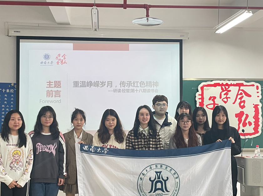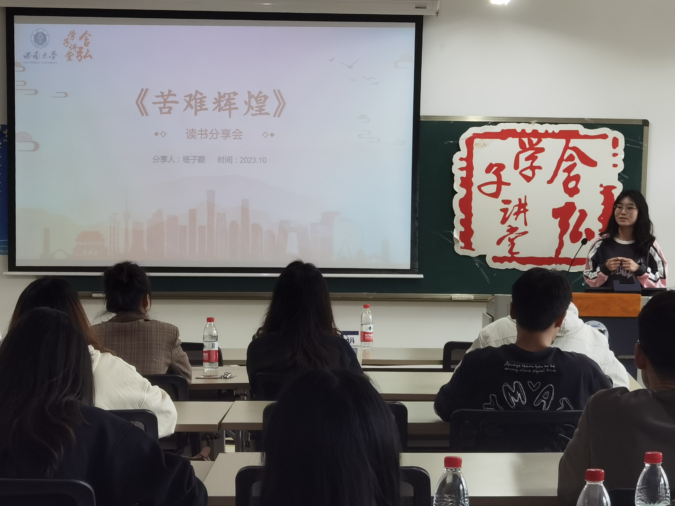 2023年10月20日下午,含弘学子讲堂之“重温峥嵘岁月,传承红色精神”读书分享会在学院A401教室举行。本次读书会由学院2022级农业管理专业硕士研究生王文明、农业经济管理专业硕士研究生罗锐、旅游管理专业硕士研究生杨子颖和金融专业硕士研究生姜迪担任主讲人。校研会代表、院研究生团总支 研究生会全体成员以及各班级研究生同学参加了此次活动。本次分享会由2023级金融学专业硕士研究生汪缘主持。