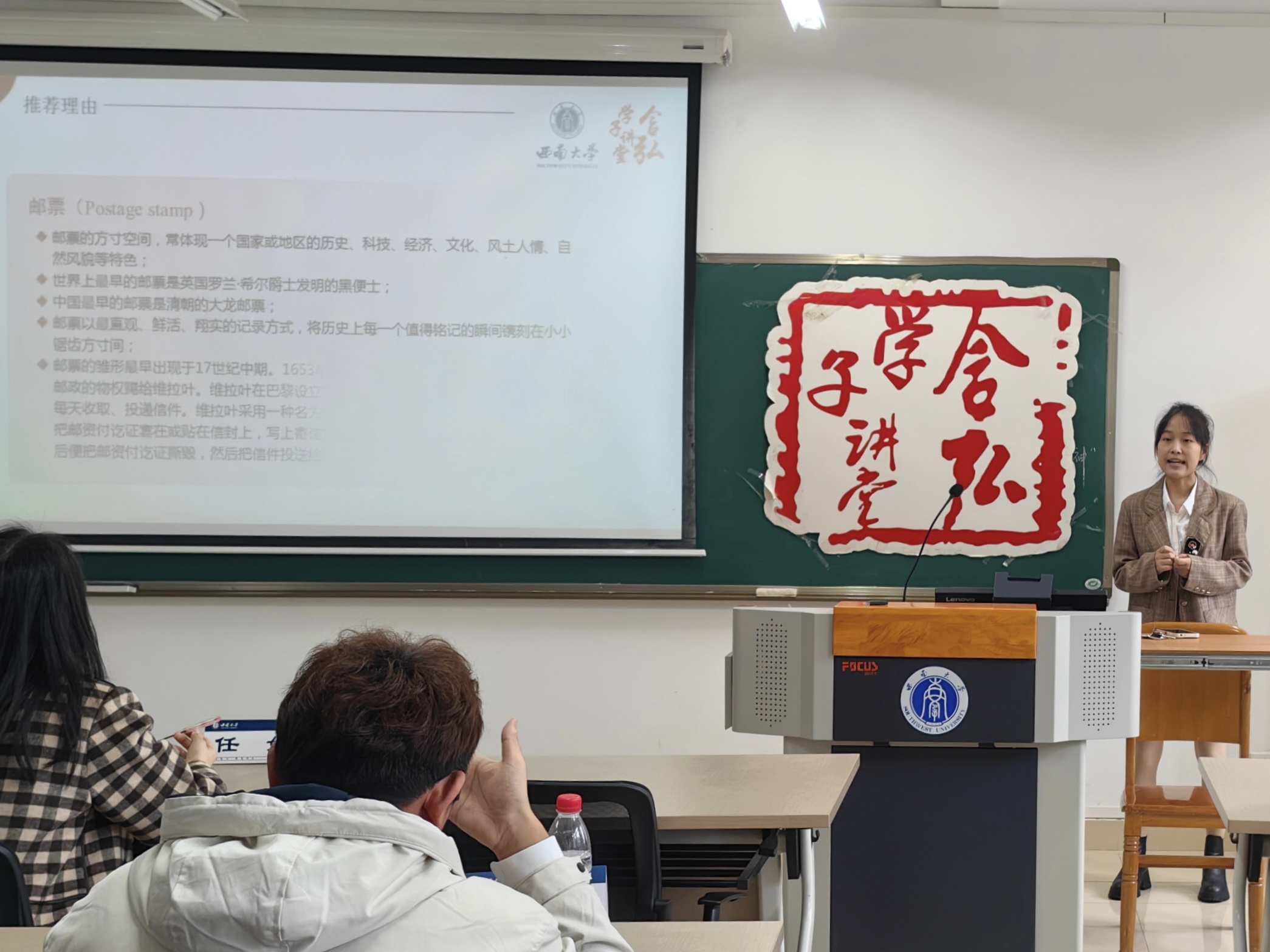 罗锐同学分享了《邮票中的百年党史》一书。该书以邮票的形式呈现,勾勒出中国共产党一路披荆斩棘、矢志不渝的百年奋斗历程。罗锐同学通过展示邮票中蕴含特殊纪念意义和历史价值的经典邮票,结合经典邮票中所记录的瞬间,介绍了许多动人的历史故事,生动而丰富地讲述了中国共产党领导中国人民从站起来、到富起来、再到强起来的辉煌历史。最后,罗锐同学分享了自己的感悟,希望能够以“邮”话“史”,牢记历史,不辜负革命先辈们的期望。
