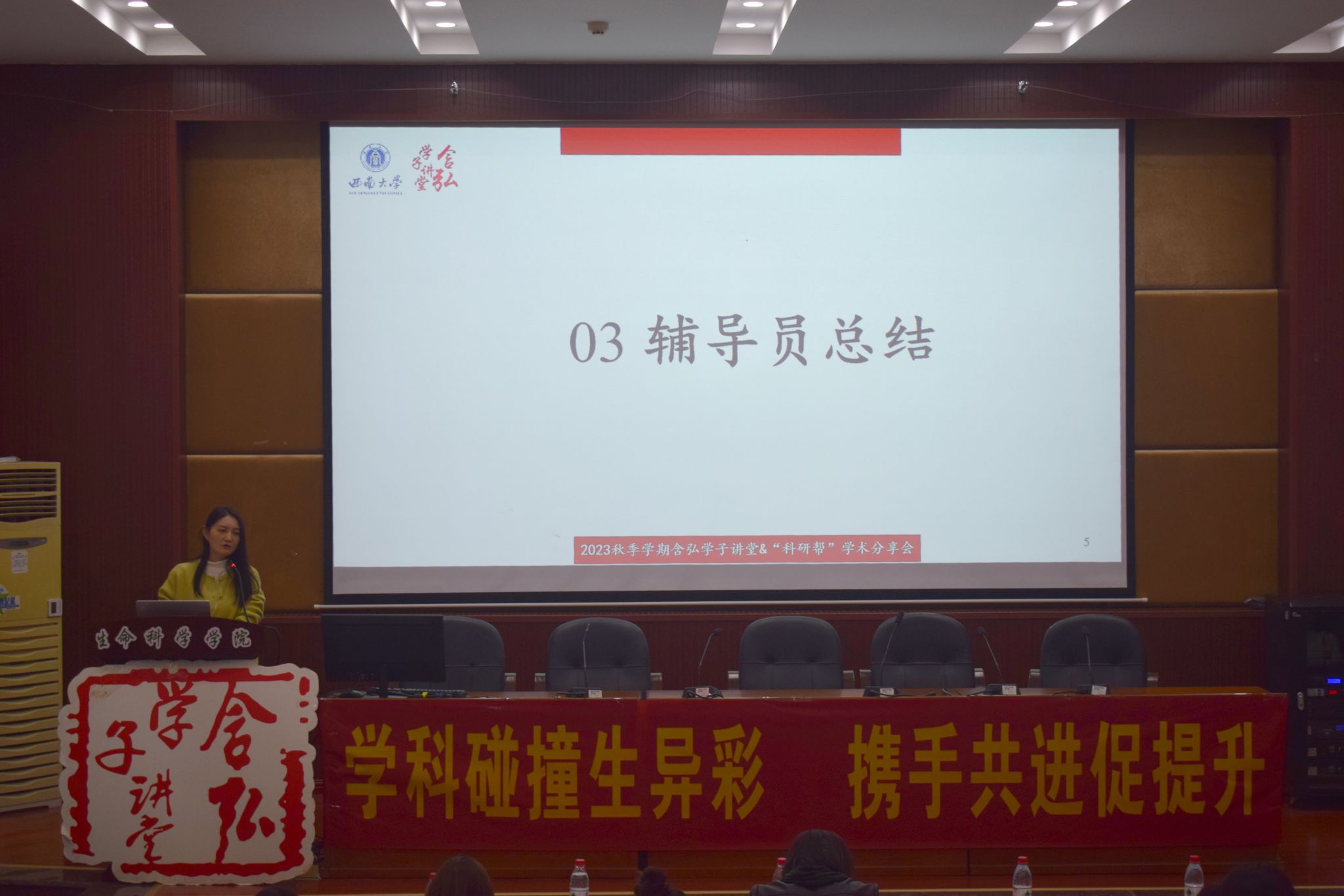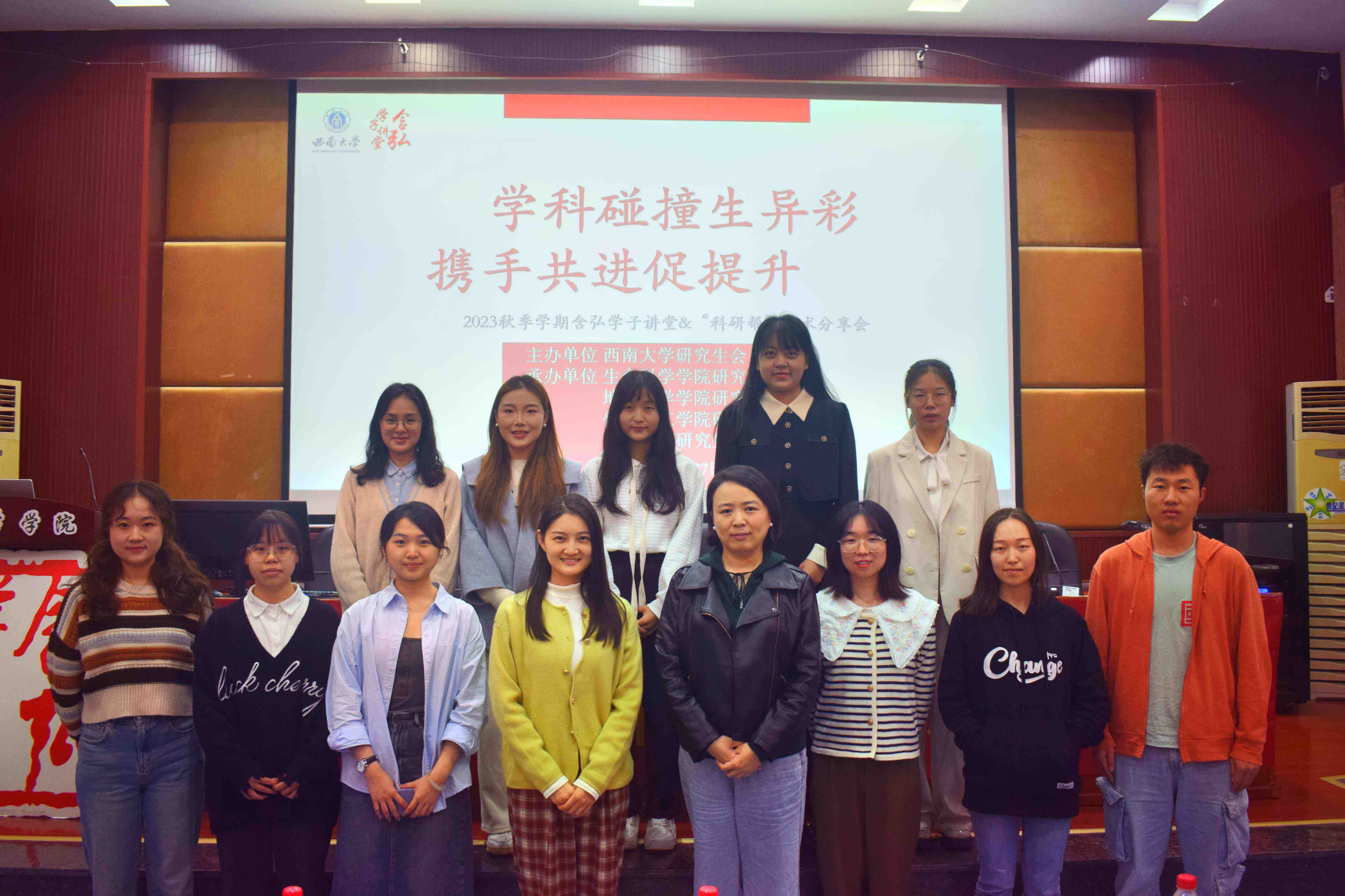 2023年10月27日下午,由betway西汉姆联研究生会主办,生命科学学院研究生会、地理科学研究生会、化学化工学院研究生以及心理学部研究生会联合承办的含弘学子讲堂之“学科碰撞生异彩,携手共进促提升”专题交流会于生命科学学院224多功能厅举行。本次活动邀请生命科学学院党委副书记石莹华老师和生命科学学院研究生辅导员谷彩霞老师出席,由来自生命科学学院2022级植物学专业博士研究生苟玉琴同学、地理科学学院2022级第四纪地质学专业硕士研究生李苏同学、化学化工学院2022级分析化学专业硕士研究生温馨同学和心理学部2022级应用心理专业硕士研究生张万双同学担任主讲人。生命科学学院研究生会、化学化工学院研究生会、心理学部研究生会、地理科学研究生会以及各学院2022级、2023级研究生参加了此次论坛。