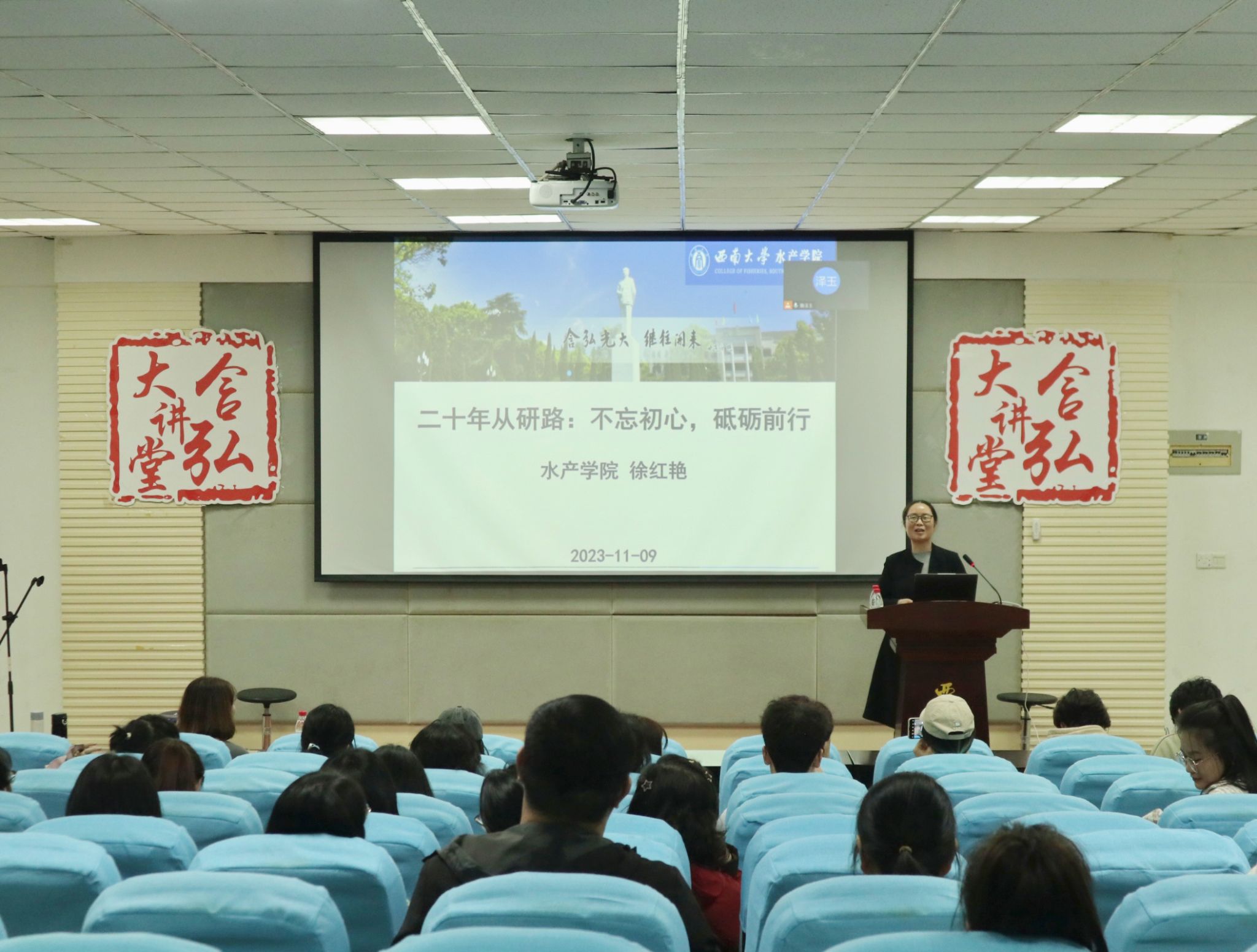 徐红艳老师以“二十年从研路: 不忘初心,砥砺前行”为主题,讲述了自己从研20年的经历。徐老师从新加坡国立大学忙碌又充实的求学之路开始,再到华东理工大学研究产重组HCG蛋白动物细胞株的构建以及大黄鱼对弧菌感染的免疫应答机制,最后来到betway西汉姆联开展科研教学,长期致力于水产动物遗传育种技术、生殖干细胞发育机制与培养应用研究。她鼓励同学们,“科研的道路是艰苦的,要坐得住“冷板凳”,理论和实践成果的取得都要耐得住寂寞。只有潜心钻研,才能迸发出创新的火花,“厚积”方能“薄发”。希望同学们在学习研究的路上一定要有不怕困难、勇于创新、潜心科研的信念。”