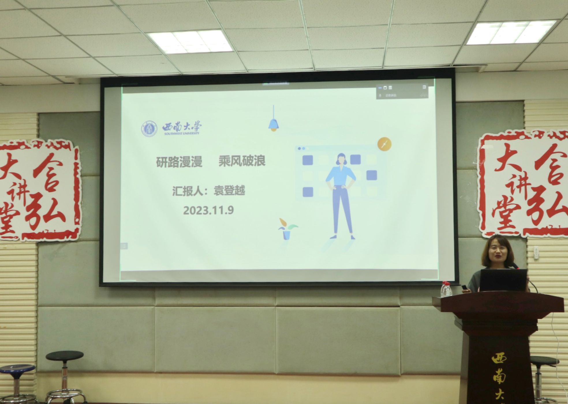 袁登越老师以“研路漫漫,乘风破浪”为主题,回顾了学习和工作经历。她工作后,又毅然选择了继续求学,全身心投入到科研学习中,来到学校后主要从事鱼类遗传多样性和环境适应性的研究。袁老师提到,“同学们的现阶段是选准科研方向、明确科研目标、开始创造性研究的关键时期,希望大家能够保持积极的学习研究态度,提高创新创造力,走好科研每一步。”