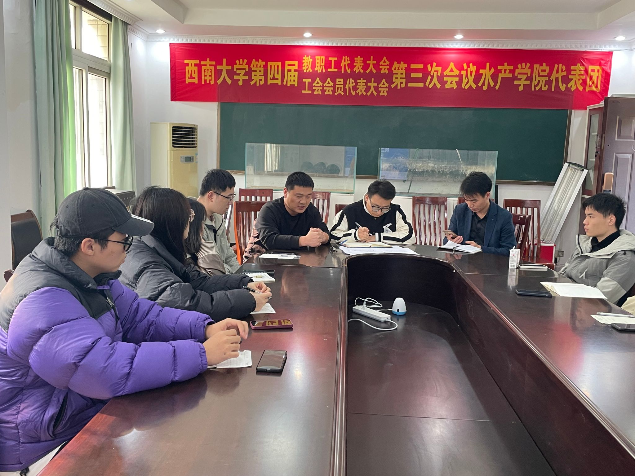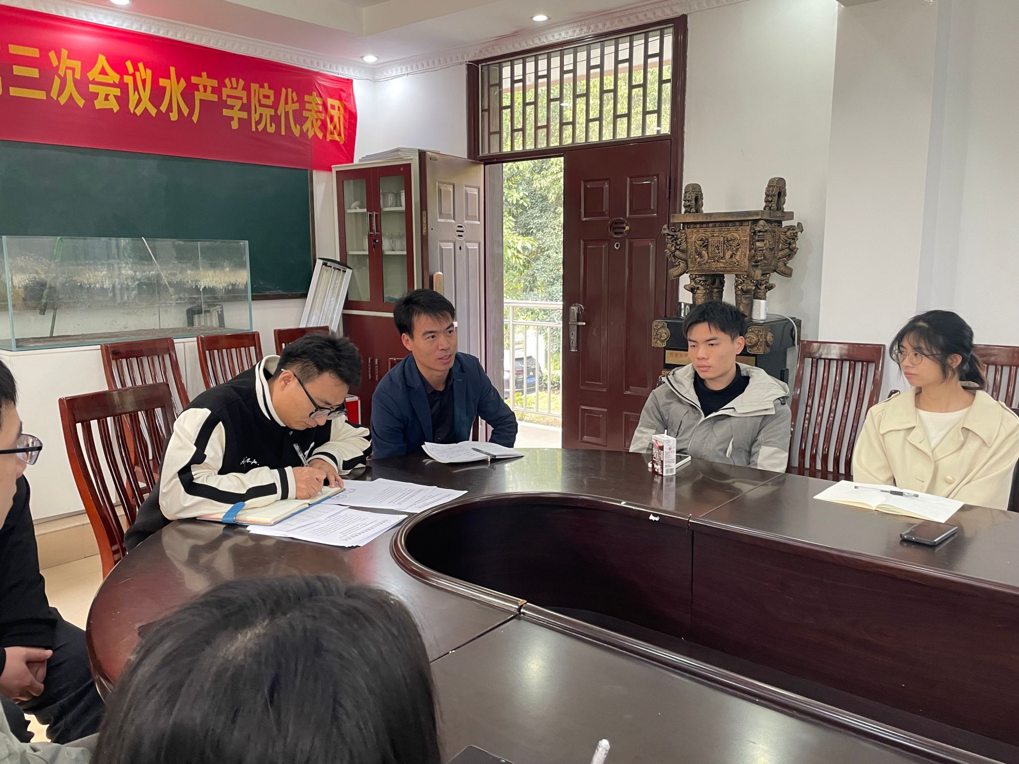 为加强研究生学风建设、砥砺学术志趣,促进朋辈交流和激励,全面、细致总结渔菁英挑战赛工作经验,持续、深入推进以赛促学风,11月24日下午,学院于北碚校区二楼会议室召开第三届渔菁英挑战赛经验总结分析交流会,第二届渔菁英挑战赛队员杜春莹、第三届渔菁英挑战赛全体队员,指导老师吴荣华、朱松参加,会议由辅导员尹斌主持。