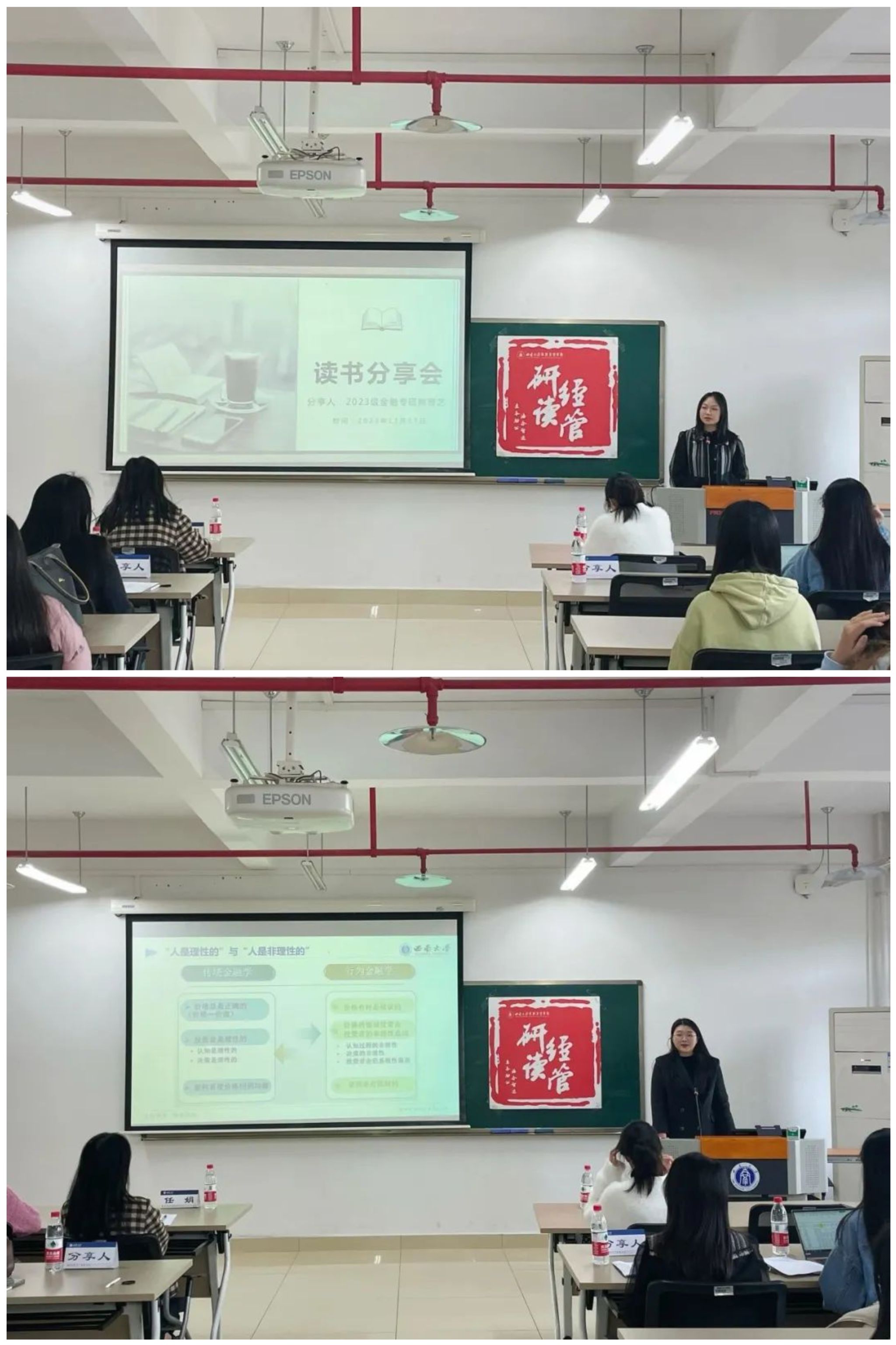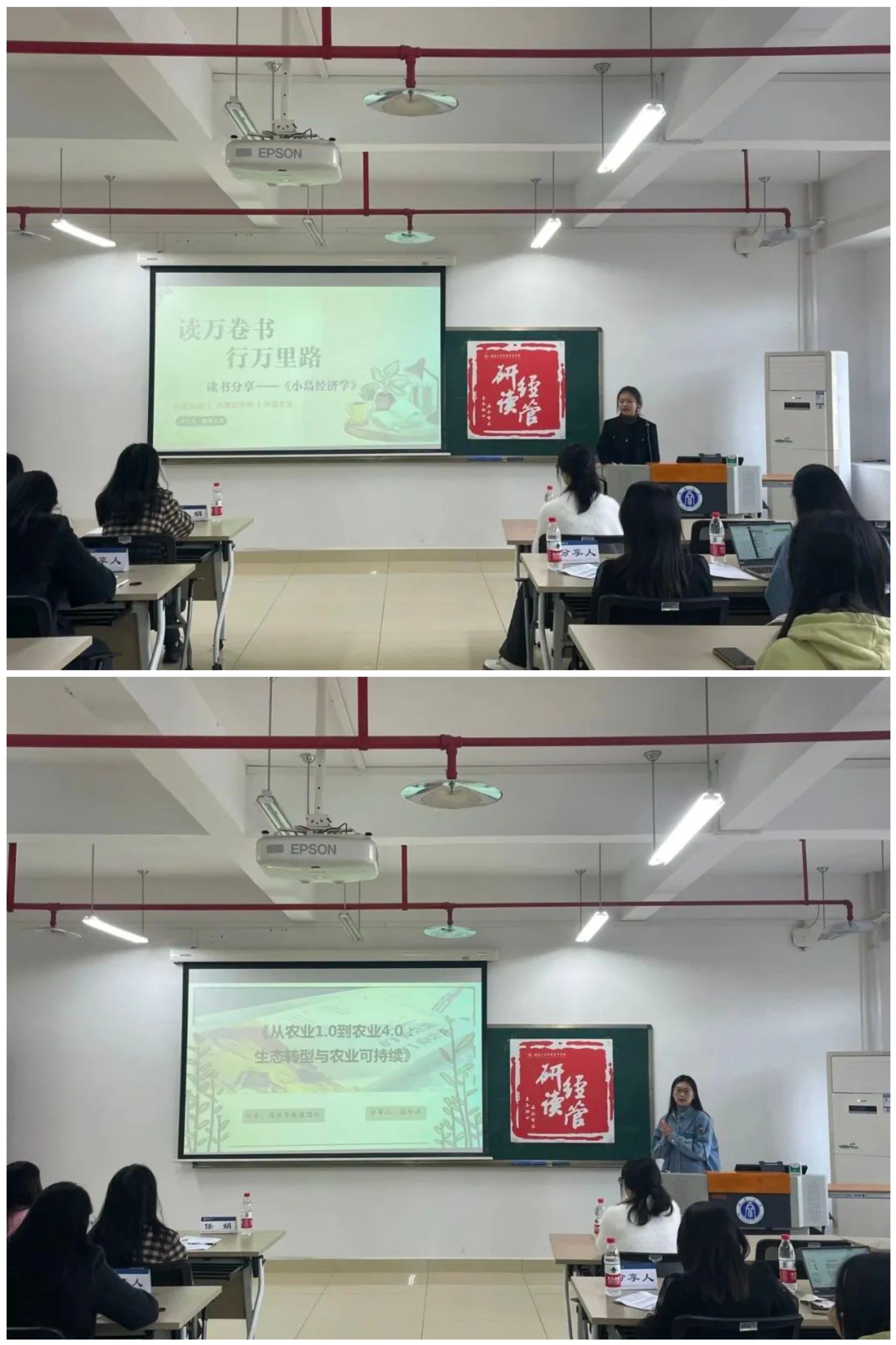 2023年11月17日下午,经济管理学院“研读 • 经管”读书会第十九期在经济管理学院A601教室举行。本次读书会以“拓宽专业视野,把握时代趋势”为主题,由学院2023级金融专业硕士研究生熊晋艺、2023级农村发展专业硕士研究生何思懿、2023级区域经济学专业硕士研究生雍林子青和2022级农业经济管理专业硕士研究生张梓祺担任主讲人,研究生辅导员任娟老师出席本次活动。本次读书会由2023级农业管理专业硕士研究生杨诗源主持。