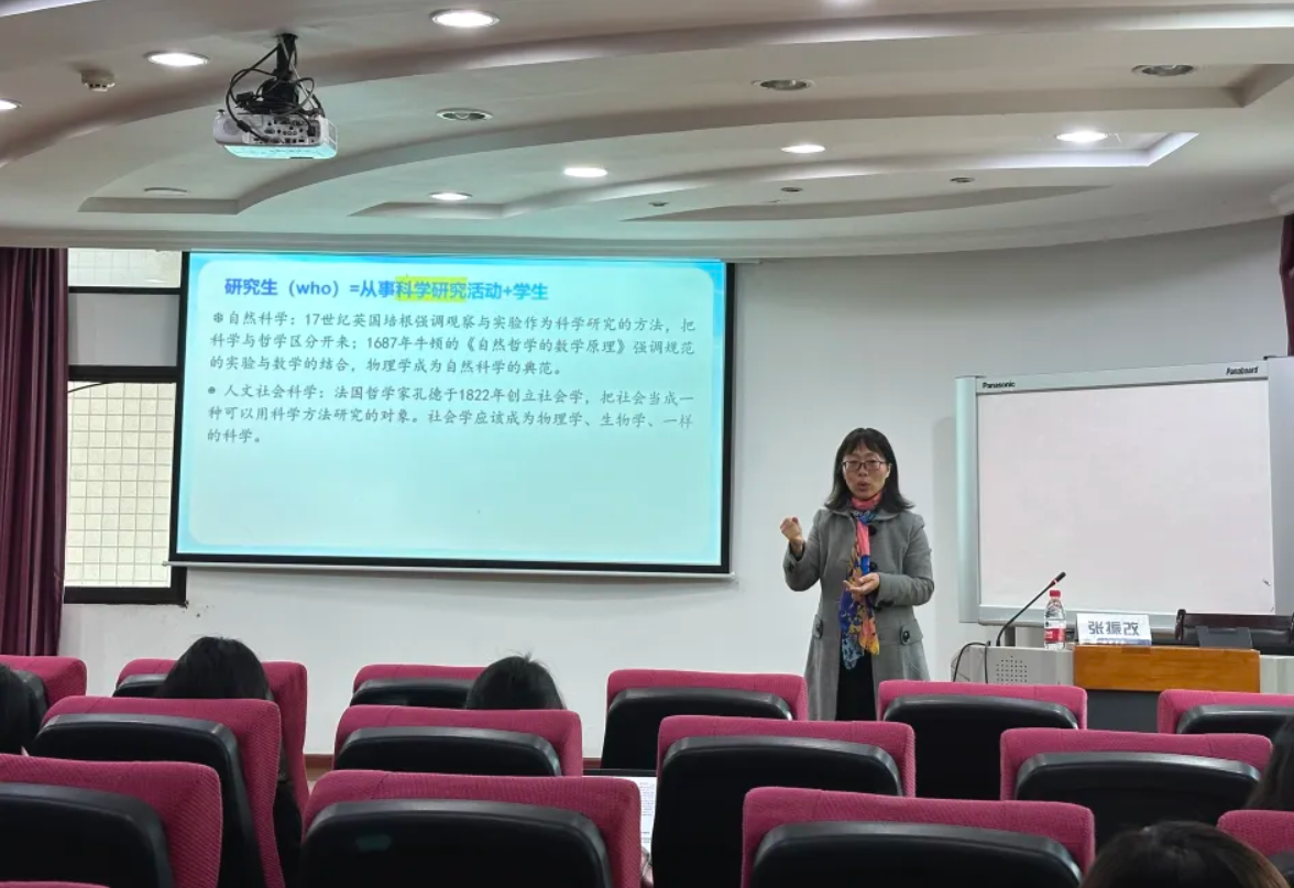张振改老师从案例警示、研究反思和政策解读三方面进行了阐释,在以学术不端典型案例敲响学术诚信警钟的同时,还着重引导研究生对“研究”的独立性进行反思,强调了研究生既需以高度的内生性需求恪守学术道德,也应明确学术道德的外在性规范划清学术不可为之界线,将学术道德真正内化于心,外化于行。精彩的讲座获得了同学们热烈掌声,让他们深受教育,也引发了研究生同学们深入的思考。
