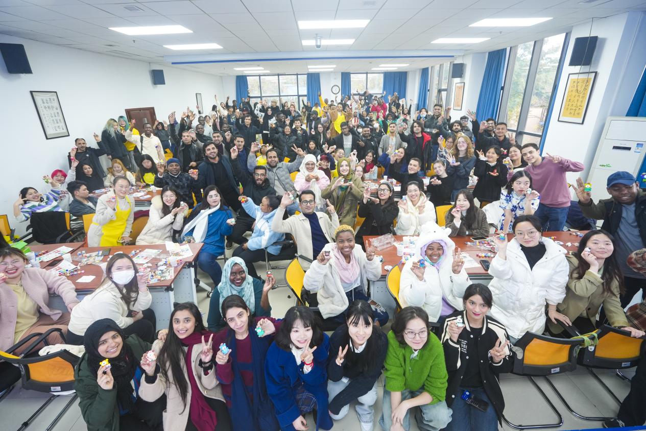 “艺”起涂鸦,心灵减压。每位同学参考本国国旗或民族其他标志,通过给小熊上色的方式,用色彩表达自己的民族身份认同及对家乡的思念。制作专属小熊的过程中,大家以配色、独特图案为线索,互相猜测对方的国家并进一步了解,在艺术海洋里沉浸式进行跨文化交际,放慢脚步、专心创作,在收获快乐的同时凝聚了归属感。