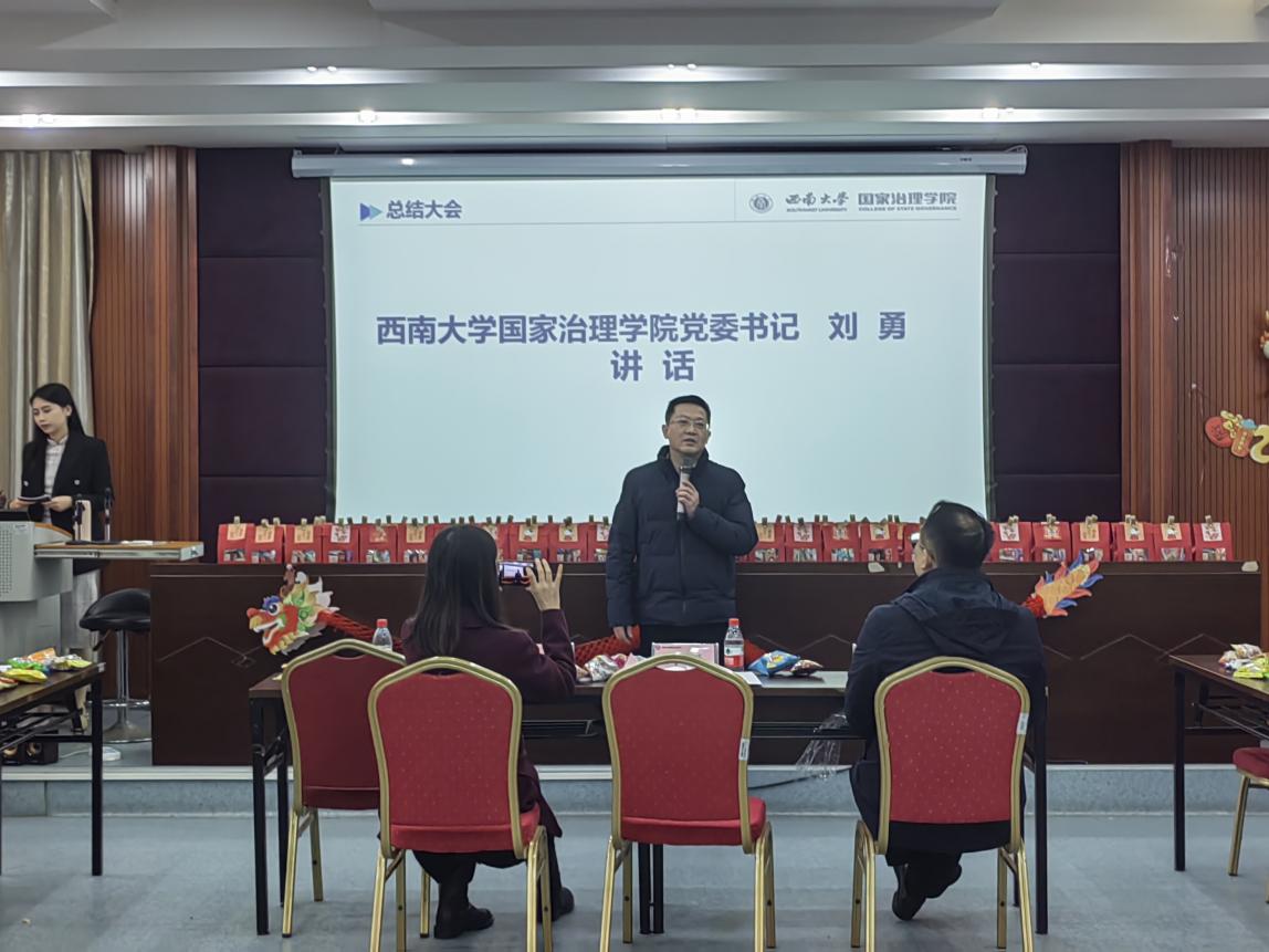最后,刘勇书记对此次大会进行总结。首先他肯定了学院本年度的工作成效,并感谢各学生骨干的辛勤工作,再一一回应了同学们提出的问题和建议。刘勇书记提到,学校的工作是“为党育人,为国育才”,我们青年学子要关注自我提升,努力成长为党和国家需要的人才。刘书记寄语学生骨干:希望国家治理学院的学子们提升思想修养,加强理论学习,更加注重科研创新和社会实践,能吃苦、肯奋斗,让青春在新时代绽放绚丽之花。