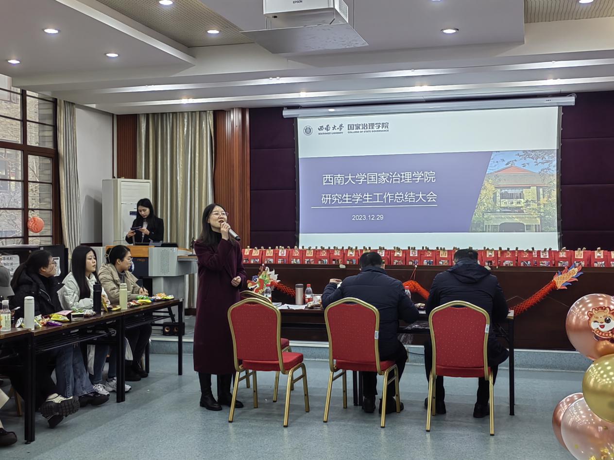 随后,学院研究生会主席团代表谢月从思想政治建设、学术科研助力、宣传平台打造、文艺体育动员、就业服务及社会实践活动等方面总结第四届研究生会2023年的工作内容,并就本年度工作中的不足提出了改进意见,明确了研究生会接下来一年的工作计划和发展方向。