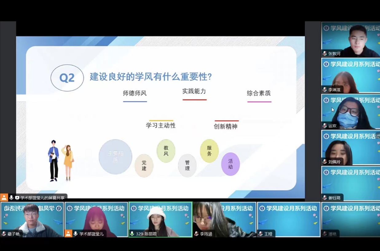 接下来是学术学风大讨论活动,首先主持人蓝莹儿介绍活动的流程,指出接下来将提出关于学术学风建设的题目,并鼓励同学们积极参与回答。互动过程中同学们积极回答相关问题,就“如何理解一个学校的学风”、“学风建设的重要性”、“作为一名研究生,你认为在平时的科研生活中如何形成良好的学风”等问题进行思考。本次活动从学校、学院、导师乃至个人角度出发回答了如何建设良好的学风、如何引导形成良好的学风以及形成学术不端的根源是什么,引导2023级研究生学术学风建设的认识和思考,培养他们的学术素养和自主思考能力。通过主持人提问引导学生对这一话题进行思考,让他们从不同的角度去思考和讨论,有助于增强他们对学术规范和学术道德的认识。
