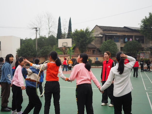 少年儿童是国家的希望与未来,因此,关注少年儿童的健康成长是中小学教育的重要工作。为此,实践队队员们特别策划课间操和趣味运动项目,助力儿童健康快乐成长。队员们带领同学们完成“我的未来我做主”课间操学习后,又在操场与学生一起进行了“智传呼啦圈”“夹气球螃蟹跑”“五十米接力赛”“丢手绢”等趣味运动项目。整个运动过程中,队员们与土场镇中心完全小学的学生心手相牵。