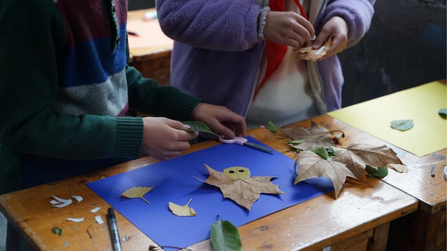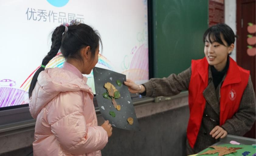 “薪火新传”实践队为孩子们带来了一堂别开生面的“树叶拼贴画”手工课堂。银杏叶、悬铃木叶、水杉叶、广玉兰叶、火炬树叶、枫香叶……这些树叶在队员们的巧手中化作一幅幅精美的拼贴画。他们不仅向孩子们介绍了各类树叶的特点和相关知识,还引导孩子们用树叶拼贴制作出各种生动的图案。在孩子们聪明的小脑袋驱动下,麻雀、金鱼、山林、蝴蝶等动植物纷纷跃然纸上。