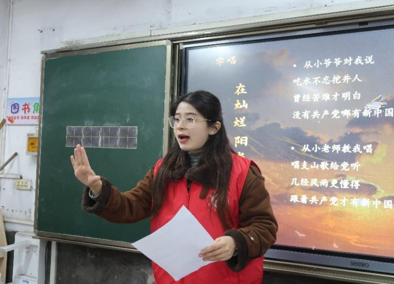 土场镇中心完全小学前身为战时儿童保育会直属第三保育院,这所诞生于战火中的学校,庇护了800多个幼小的生命。如今,在新时代的春风下,队员们带领孩子们在这片土地上唱响《在灿烂阳光下》,并介绍了这首歌的创作背景,与他们一起感受历史与当下的交融。在队员的教学下,同学们配合着手势舞齐声高唱“从小爷爷对我说,吃水不忘挖井人,曾经苦难才明白,没有共产党哪有新中国……”手势舞整齐,歌声高昂,孩子们也在歌声中感受到了党的恩情和新中国的伟大。