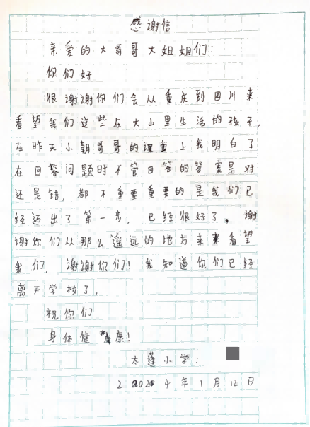 在“同心圆”寒假调研活动圆满结束后,中心的团队收到了一系列由学生亲手写成的感谢信。这些信件不仅表达了学生们对中心团队的深深感激,还分享了他们在活动中的收获和成长。许多学生提到,这次活动不仅让他们学到了宝贵的知识技能,还激发了他们对未来学习的热情。这些满载深情的信件不仅展示了学生们的成长和变化,更凸显了这次寒假调研活动深远的意义。