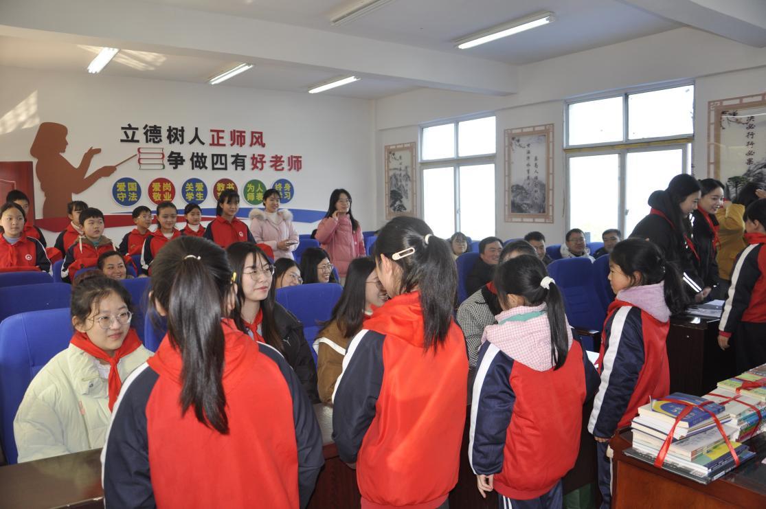 11日上午,中心“同心圆”寒假调研团队抵达太蓬小学,与该校代表进行深入的交流和互动。首先,双方代表分别介绍各自学校的历史、特色、优势和挑战等方面信息,增进彼此的认识和了解。随后,中心团队与乡村小学代表访谈交流,进一步了解乡村小学生的学习情况、生活情况、成长需求和困难挑战等,为后续的帮扶工作提供了参考依据。接着,中心“同心圆”团队指导老师陈伦超代表所有团队成员,向太蓬小学捐赠了一批精美的图书,书籍涉及文学、科学、艺术等多个领域,旨在为乡村小学提供更多的阅读资源,丰富留守儿童的精神生活。最后,太蓬小学的学生代表向中心团队的成员献上红领巾,并致以敬礼,表达对中心团队的敬意和感谢。