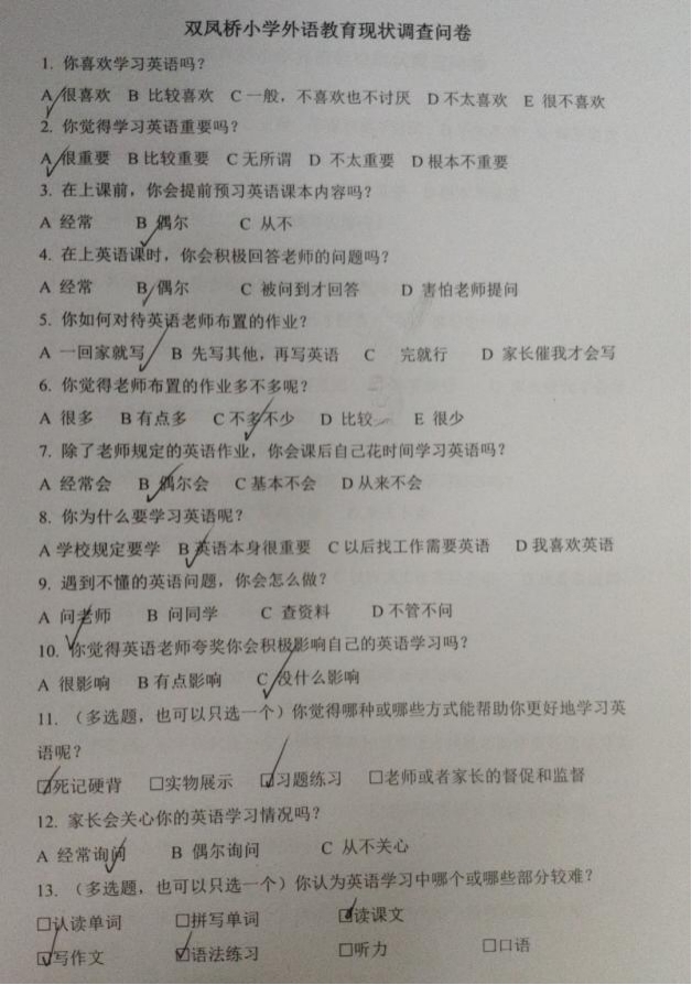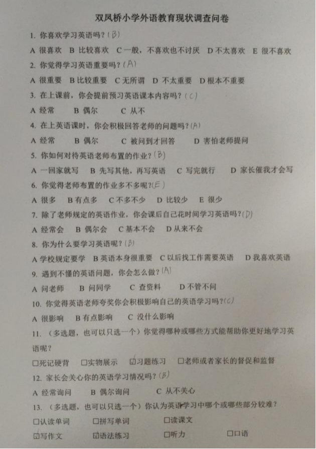 实践队成员采取了多样化的方法,如师生访谈、问卷调查和随堂听课等,来深入探究双凤桥小学的多方面情况,如学校的生源状况、英语师资力量、教学管理流程、课程设置、教学设施配备以及乡村教育振兴政策的实施效果。通过这些细致的调研,实践队成员编撰了一份全面的调研报告。该报告不仅为学校提供了对当前英语教学中存在问题的深刻洞见,还提出了解决这些问题的可行建议,展现了年轻一代的智慧和创造力。这些努力对于提升学校的教学质量和解决具体教学难题具有重要意义。