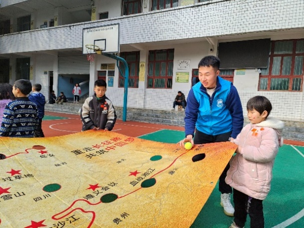 1月10日,实践队队员带领小朋友们开展室外趣味游戏活动。重走模拟的红军路线,感受红军前赴后继的英勇;“长征路进洞”的挑战,在游戏的乐趣中加深对红军行进路线的记忆;丢沙包和跳大绳环节,在欢笑声中培养团队协作精神,感受集体的力量……活动结束后,小朋友们纷纷在横幅上签名留念。通过组织小朋友们进行户外活动,让他们亲身体验红军的艰辛与坚韧精神,不仅使小朋友们更好地