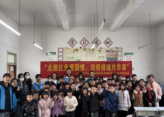 为深入学习习近平新时代中国特色社会主义思想,全面贯彻落实党的二十大精神,助力乡村教育,弘扬教育家精神,引导广大青年研究生在实践中坚定理想信念,在奋发有为中践行初心使命。2024年1月7日至11日,地理科学学院“经天纬地,坚育桃李”实践队全体成员以“点燃红色爱国情,培根铸魂共华章”为主题,前往重庆市酉阳县泔溪镇泉孔小学开展寒假社会实践活动。