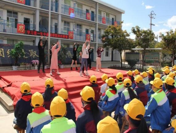 节目表演现场,舞台灯光璀璨夺目,营造出温馨愉悦的氛围。实践队队员与学生们的默契配合,带来了精彩纷呈的节目表演。实践队队员们以一曲《弥渡山歌》舞蹈串烧,拉开了本次活动文艺汇演及颁奖仪式的序幕。一首首经典民乐与特色民歌萦绕在上赤小学的操场上空,孩子们伴着乐声开心舞蹈与歌唱。志愿者带来的维吾尔族舞蹈《葡萄架下的篝火》更是点燃了孩子们参与活动的热情。为进一步激发与培养孩子们的学习热情与自信,一二年级的孩子们在志愿者的带领下首次登台表演舞蹈《勇气大爆发》等节目。