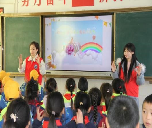(图2:队员赵玥、黄飞扬在3-4年级开展乐理知识教学)