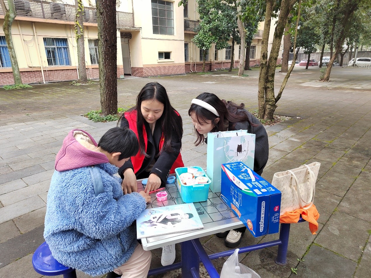 实践队另一支关爱困境儿童的小分队跟随着澄江镇小学的老师来到了重庆市北碚区第二精神卫生中心,看望患有智力障碍的小革同学,将关爱从学校延伸到医院。根据学校老师的讲述,关爱小革同学是学校的常态工作,每周都会派出两名任课老师前往医院看望他,对其进行简单的授课,切实让特殊群体学生也能够得到学习的机会。在这次关爱活动中,实践队的陈俊伶和李凤同学耐心地手把手教小革同学数数、画画、捏泥人。小革同学的笑容一直挂在脸上,他的阳光和对未来的渴望也感染了我们。相信在更多的社会爱心人士的关怀下,在更多志愿者们的帮助下,像小革这样的困境儿童能够不断地增强获得感、幸福感和安全感。